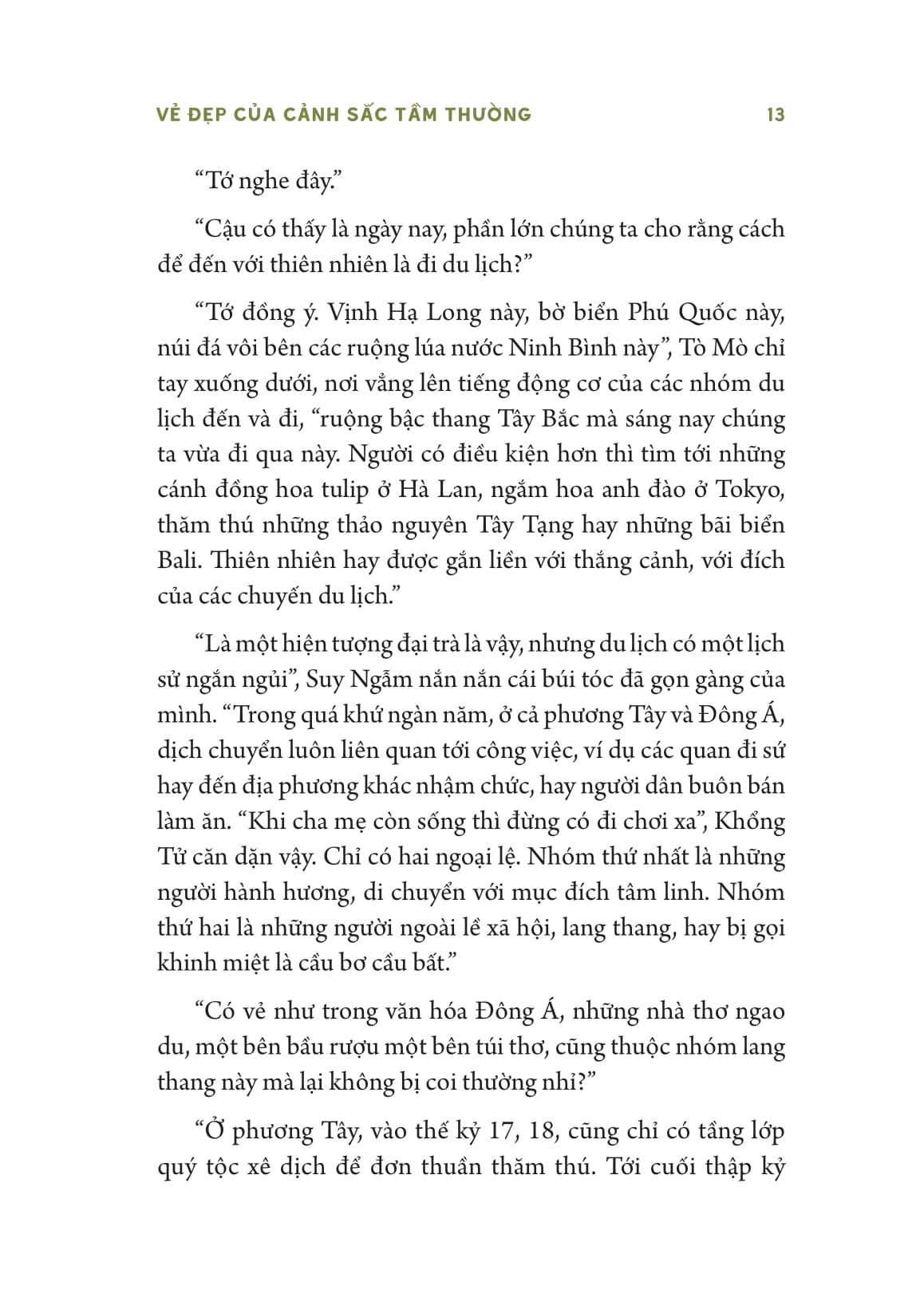 Cuốn sách “Vẻ đẹp của cảnh sắc tầm thường” mở ra những con đường mới để mỗi người có thể phát triển khả năng rung động và kết nối sâu sắc với mọi hình thái của thiên nhiên, thay vì chỉ với những phong cảnh hợp ram. Hành trình của Tò Mò và Suy Ngẫm cũng giúp ta đi xuyên qua vẻ bề ngoài để cảm nhận được vẻ đẹp của sự phong phú, phức tạp và bí ẩn của âm thanh và mùi vị; của chuồn chuồn, nhện và bướm di cư; của đầm lầy, hoa tàn và lúc xấu trời - những điều mà trước kia ta coi là bình thường, thậm chí tầm thường, xấu xí.