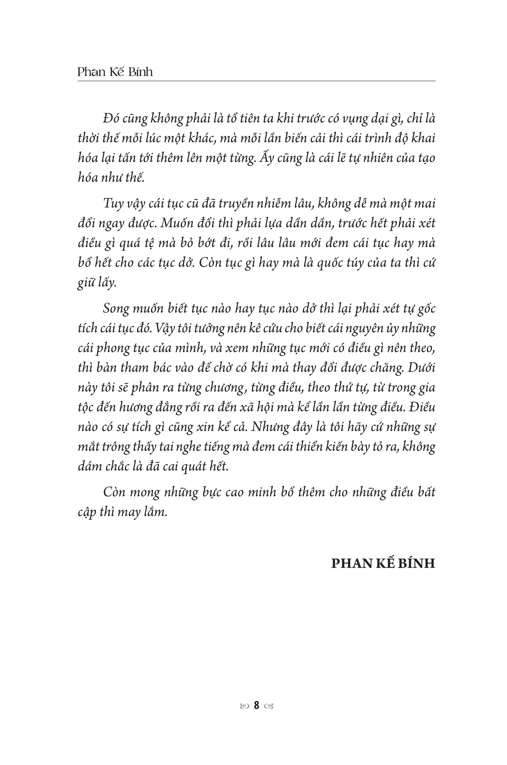 Mỗi nước có một phong tục riêng. Phong tục ấy kỳ thuỷ hoặc bởi tự một vài người mà rồi bắt chước nhau thành ra thói quen. Hoặc bởi ở phong thổ và cách chính trị, cách giáo dục trong nước mà thành ra. Hoặc bởi các phong tào ở ngoài tràn vào rồi mà dần dần tiêm nhiễm thành tục. Nhưng đại để tục gì cũng vậy, phải trải lâu tháng lâu năm mới thành được, mà trong những tục ấy cũng có tục hay, cũng có tục dở. Duy chỉ bởi tai mắt người đã quen, lòng người đã tin dùng, thì dẫu có người biết là dở mà cũng không sao đổi ngay đi được