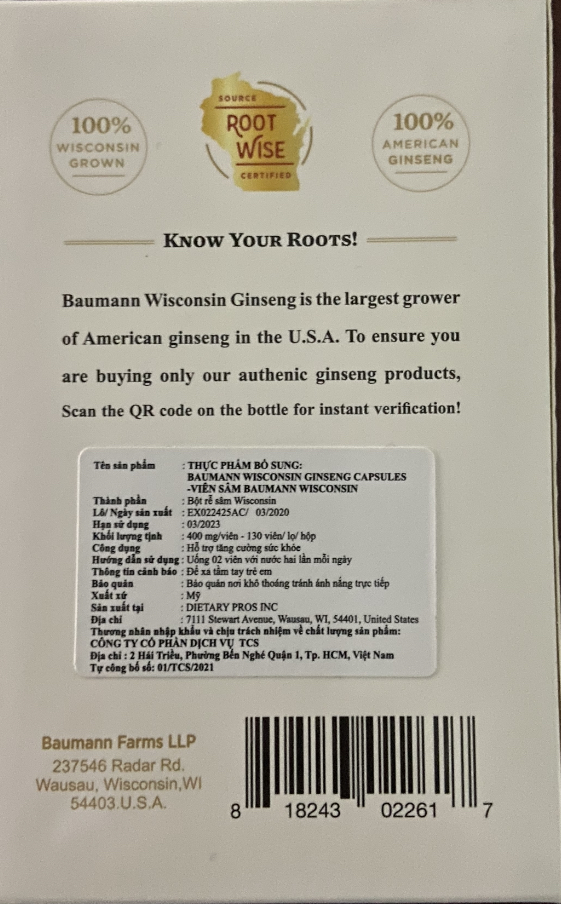 - Thương hiệu: Baumann Wiscosin Ginseng.