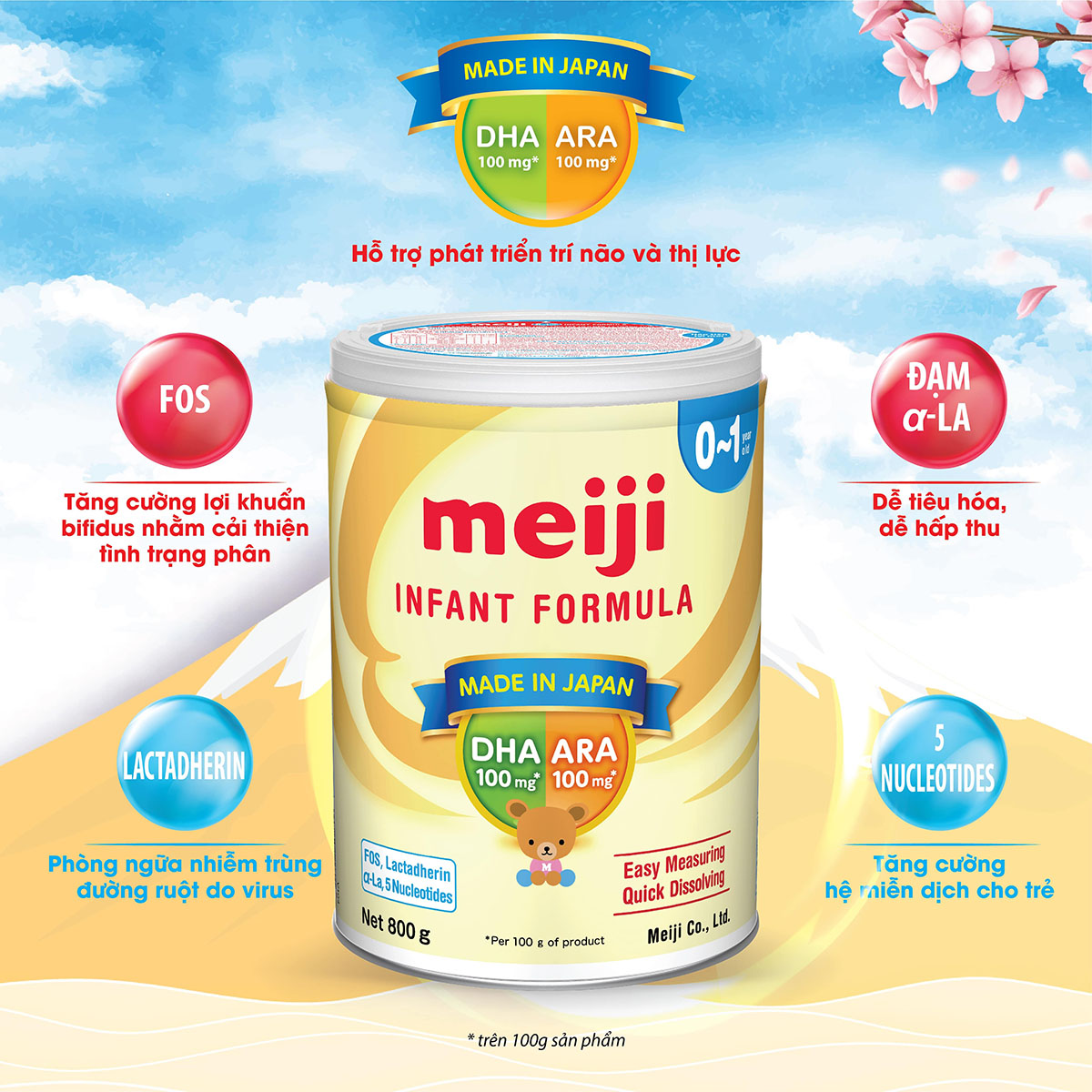 Sản phẩm dinh dưỡng công thức Meiji Infant Formula 800g (Dành cho trẻ từ 0-1 tuổi) Giới thiệu Sữa Meiji Infant Formula 800g là một trong những lựa chọn hàng đầu của các mẹ khi