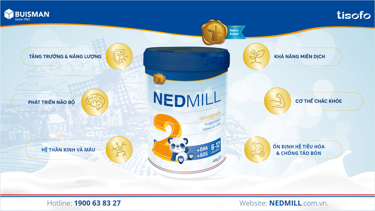 Sản phẩm dinh dưỡng công thức NEDMILL stage 2 cung cấp hệ vi chất cân bằng và tối ưu trong trường hợp trẻ không được nuôi bằng sữa mẹ. Sữa NEDMILL stage 2 là một phần trong chế độ ăn đa dạng của trẻ nhỏ từ 6 đến 12 tháng tuổi. NEDMILL stage 2 cung cấp các dưỡng chất quan trọng cho bé yêu phát triển tốt. Chất xơ GOS thúc đẩy sự phát triển của lợi khuẩn, hỗ trợ đường ruột non nớt của bé khỏe mạnh, phòng ngừa táo bón, tiêu chảy. DHA và ARA hỗ trợ phát triển trí não. Selen, Kẽm, Sắt và các chất chống oxy hóa như Vitamin A, Vitamin C và Vitamin E giúp tăng cường hệ miễn dịch. Kẽm và Nucleotide hỗ trợ sức đề kháng, giúp bé luôn khỏe mạnh. Sữa NEDMILL stage 2 còn cung cấp Canxi, Vitamin D cho bé phát triển chiều cao và phát triển hệ xương răng chắc khỏe.