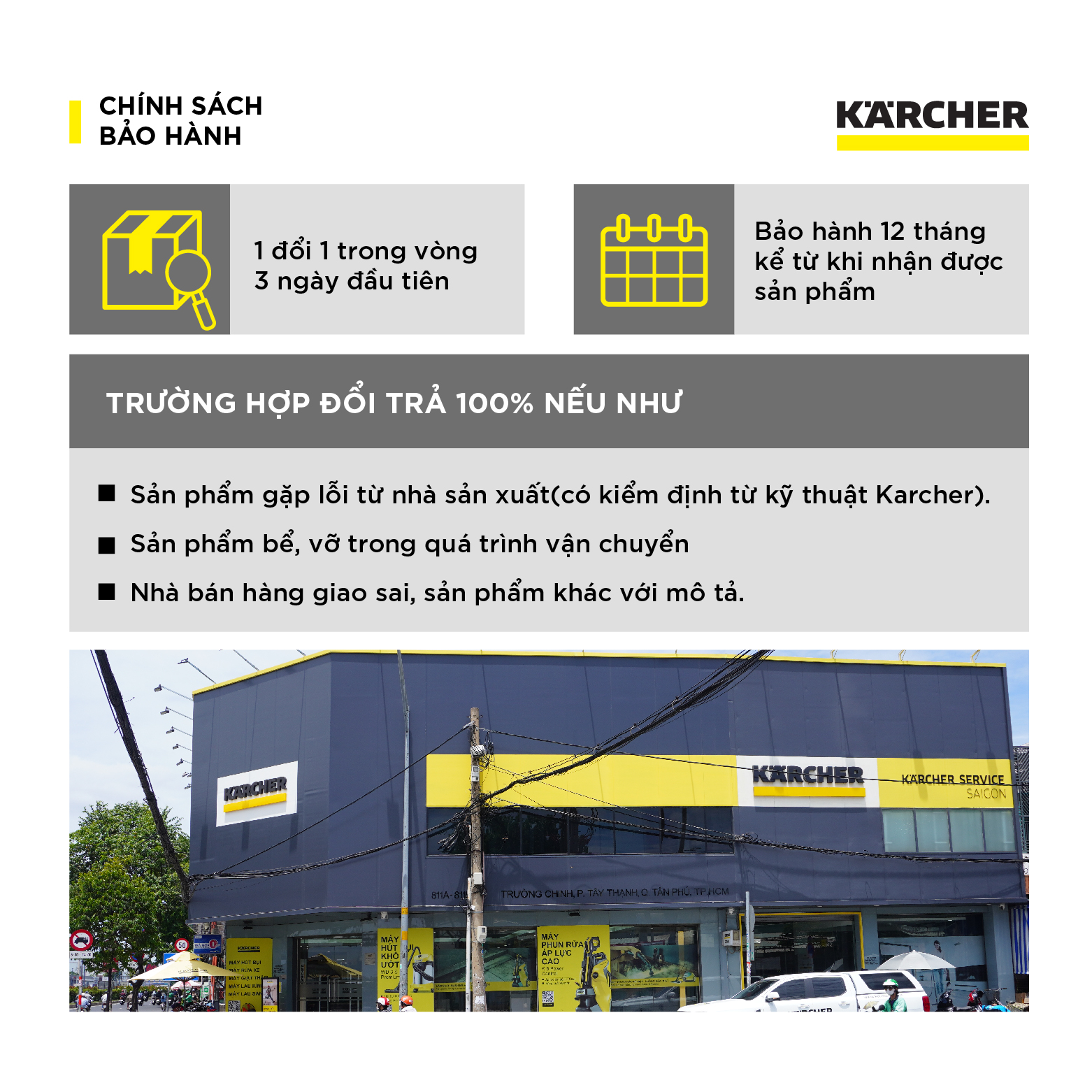 - Kết hợp với các mẹo làm sạch, mẹo vệ sinh nhà cửa, mẹo rửa xe, mà Karcher cung cấp để đạt được hiệu quả tốt nhất CHÍNH SÁCH BẢO HÀNH KARCHER - Với phương châm luôn hướng tới khách hàng. Các sản phẩm khi mua ở Karcher luôn có chế độ bảo hành phù hợp cho khách hàng