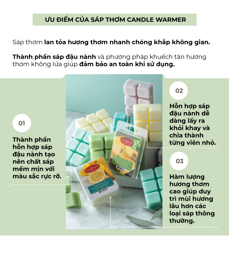 Hương thơm dịu nhẹ, thoáng mát, dễ chịuSáp thơm Aroma tạo hương thơm tự nhiên, nhẹ nhàng, mang đến cảm giác thoải mái, giúp nhanh chóng xóa tan mệt mỏi, đem lại cảm giác dễ chịu