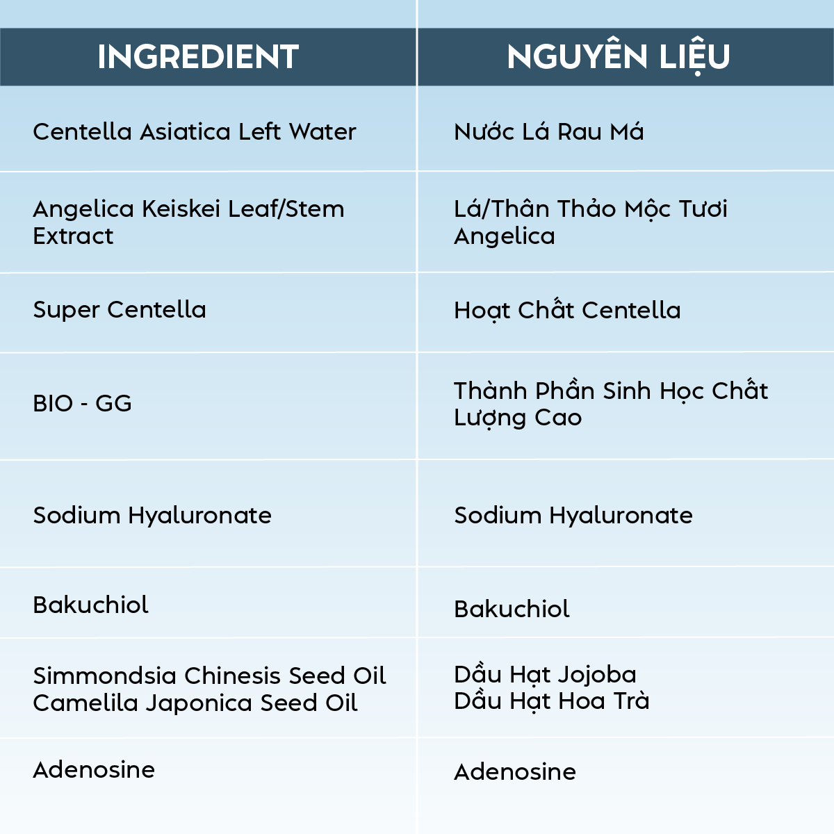 ● BIO-GG: kích hoạt các kênh dưỡng ẩm, giúp tăng độ đàn hồi và tăng khả năng thẩm thấu của sản phẩm
