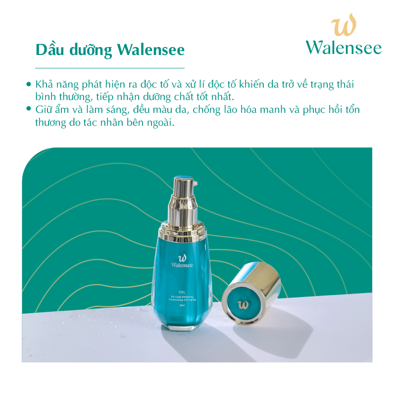 Dầu dưỡng Walensee có khả năng phát hiện ra độc tố và xử lý độc tố khiến da trở về trạng thái bình thường, tiếp nhận dưỡng chất. Dầu dưỡng siêu nhẹ chứa Squalane, olive, Nano Vitamin C, Melano Toner và Geno-W giúp giữ ẩm và làm sáng da rõ rệt. Dầu dưỡng có thể trộn với mọi loại dưỡng da để tăng hiệu quả và đem lại bề mặt da bóng bẩy mượt mà, bắt sáng. Dầu có khả năng phục hồi da và chống lão hóa mạnh mẽ chỉ sau 1 đêm sử dụng nhờ tinh chất được tinh chế siêu nhỏ mịn giúp thẩm thấu sâu xuống lớp biểu bì chứ không chỉ nằm trên bề mặt da giúp:
