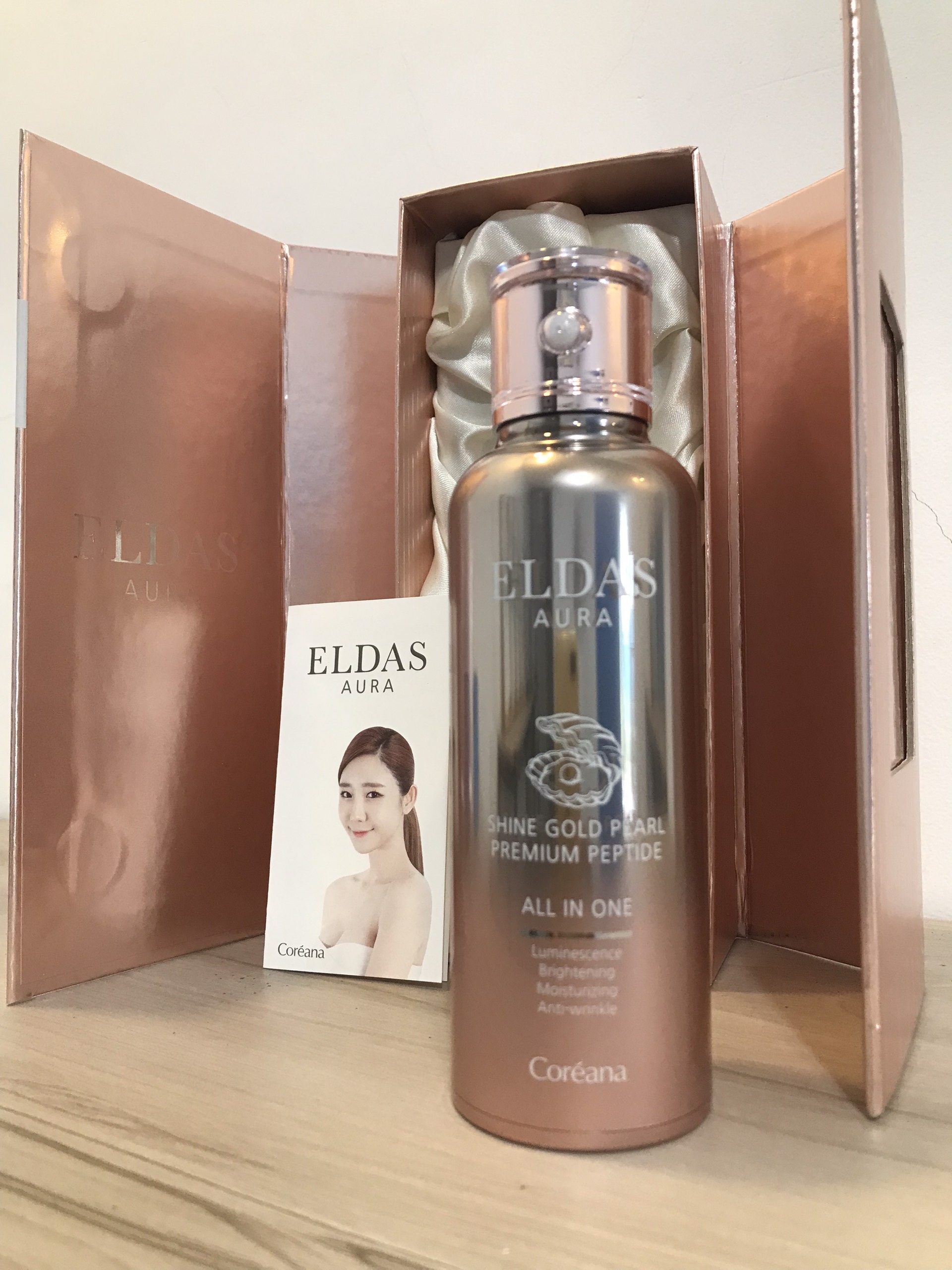 - Eldas Aura là sản phẩm được biết tới với tính năng 4 trong 1 bao gồm Toner + Lotion + Essence + Cream giúp bạn giải quyết mọi vấn đề của da chỉ với 1 sản phẩm. Chiết xuất bột ngọc trai chứa khoáng thiên nhiên và amino acid làm mờ tàn nhang, đốm thâm và dưỡng da trắng hồng. Kết hợp với Collagen, tinh chất vàng ngăn ngừa các dấu hiệu lão hóa, duy trì sự săn chắc, đàn hồi, ngăn chặn sự chảy xệ, giảm nếp nhăn do tuổi tác, giữ cho làn da luôn tươi trẻ. (*)