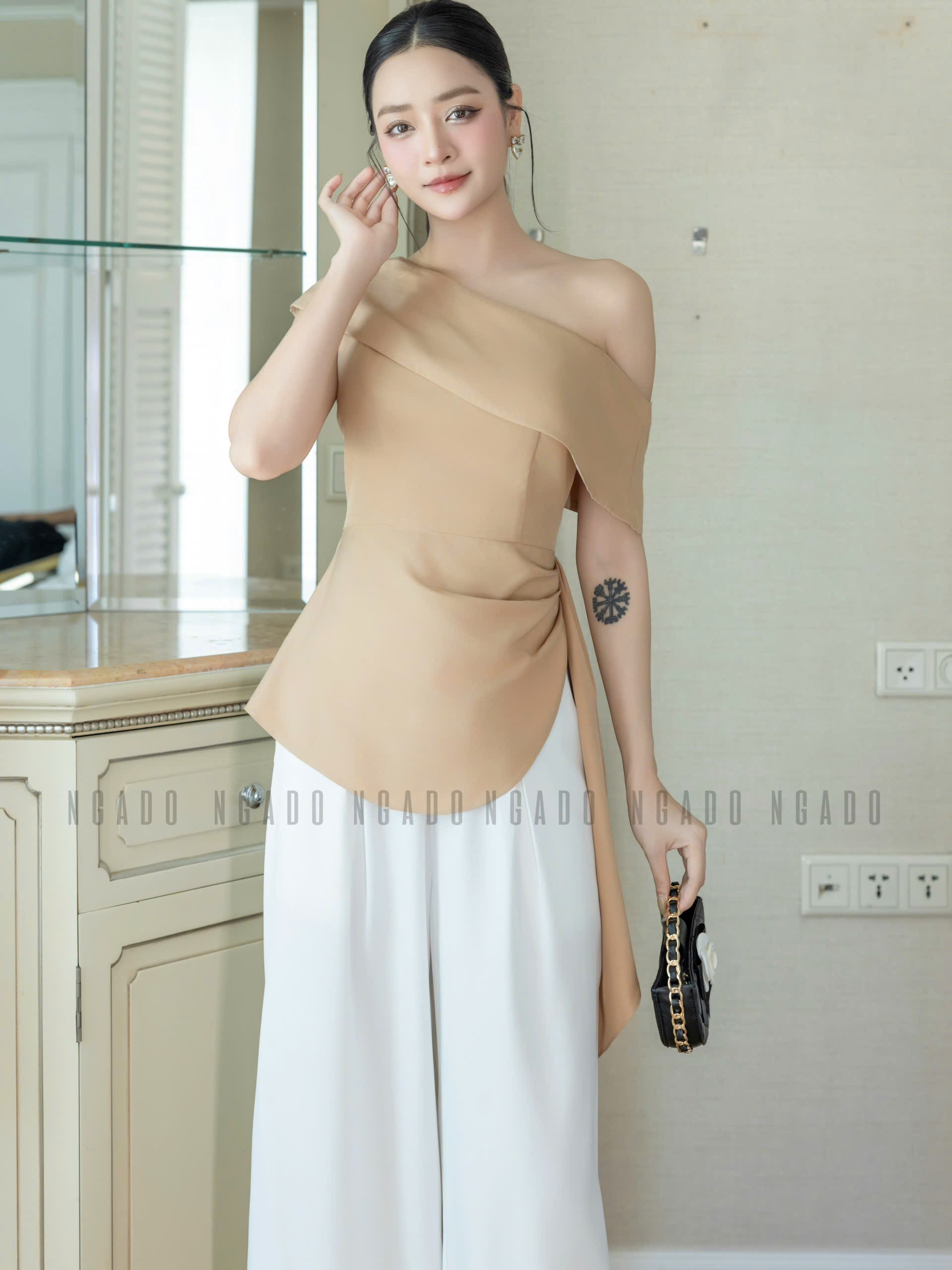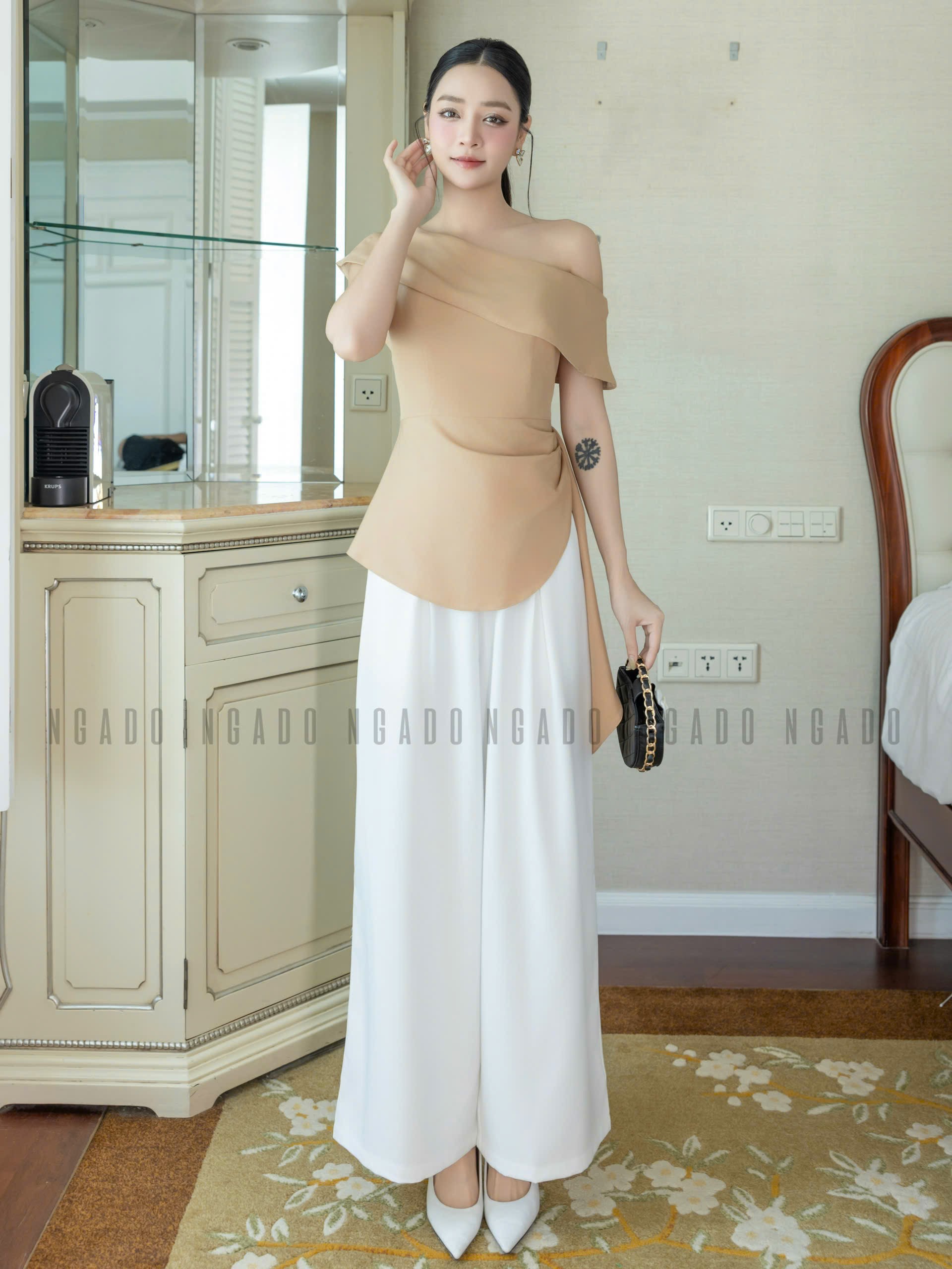 ✨Set áo quần nude trắng lệch vai NGADO , set áo quần dài