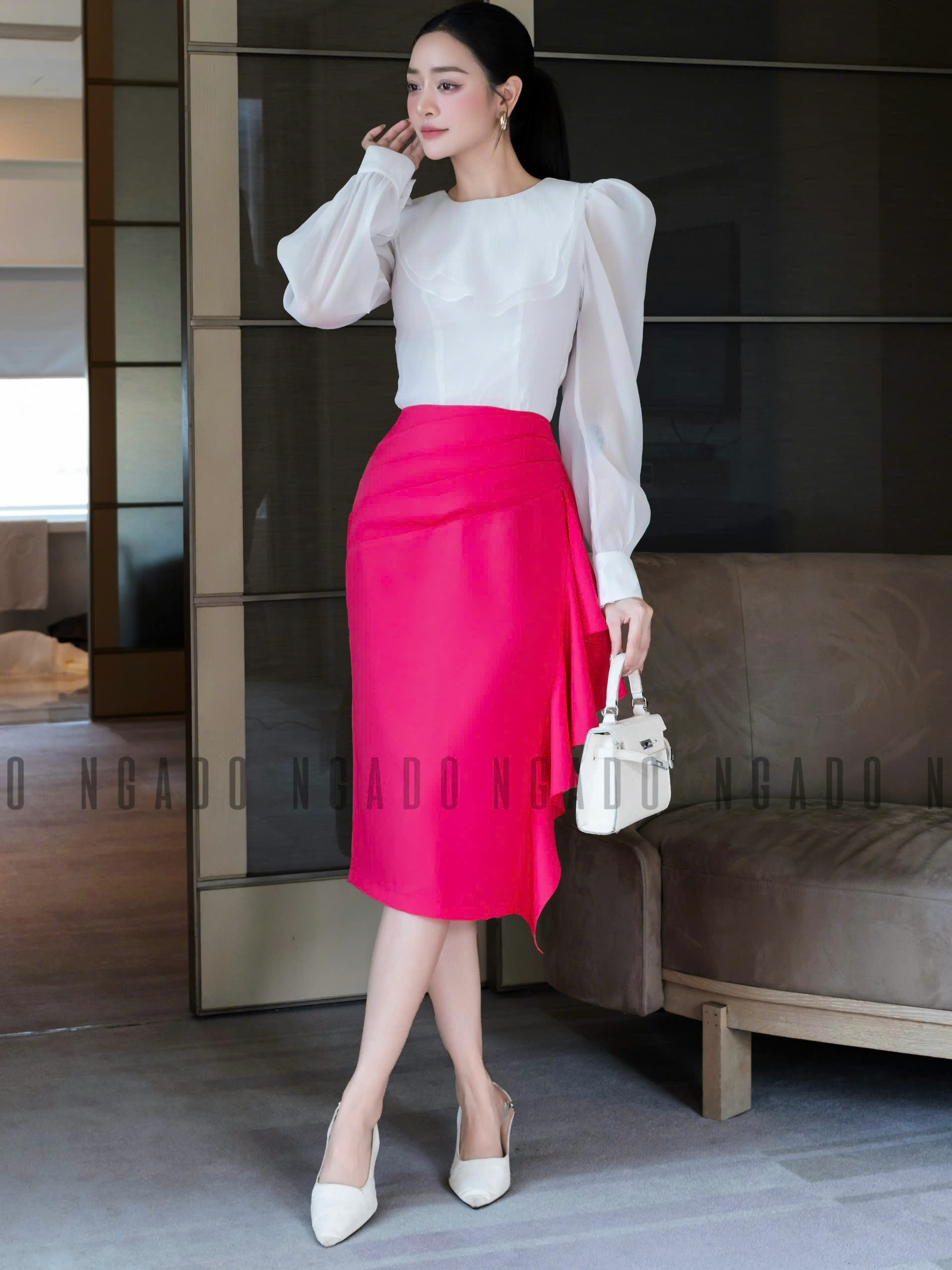 ✨Set áo voan trắng váy hồng sen NGADO , set áo kèm chân váy , set áo váy Nữ