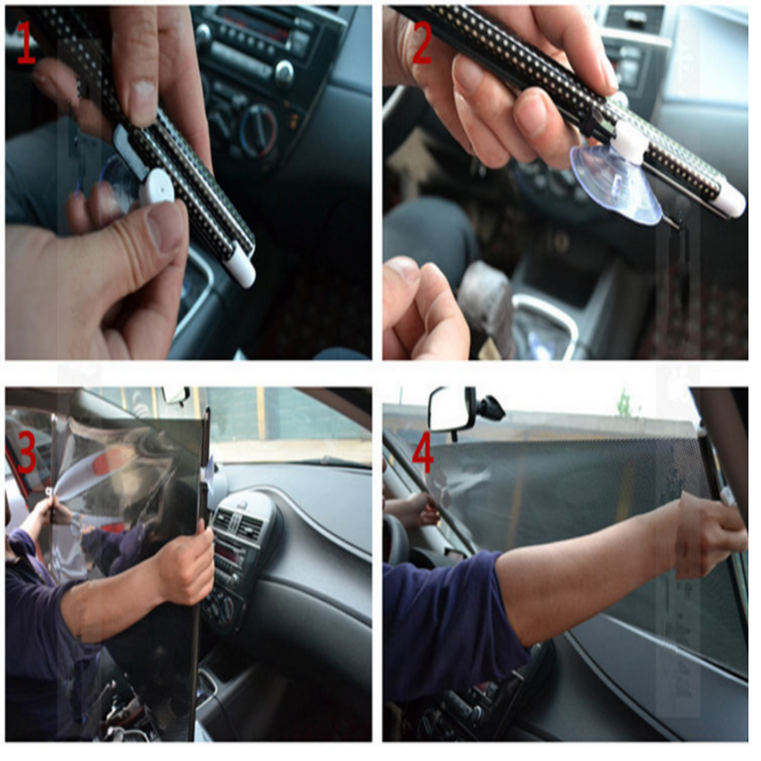 Bộ rèm che nắng gồm có 4 miếng cho 4 cánh cửa xe hơi. Sử dụng dễ dàng bằng cách đưa rèm lên sát mặt kính xe, nam châm trên rèm sẽ giúp rèm cố