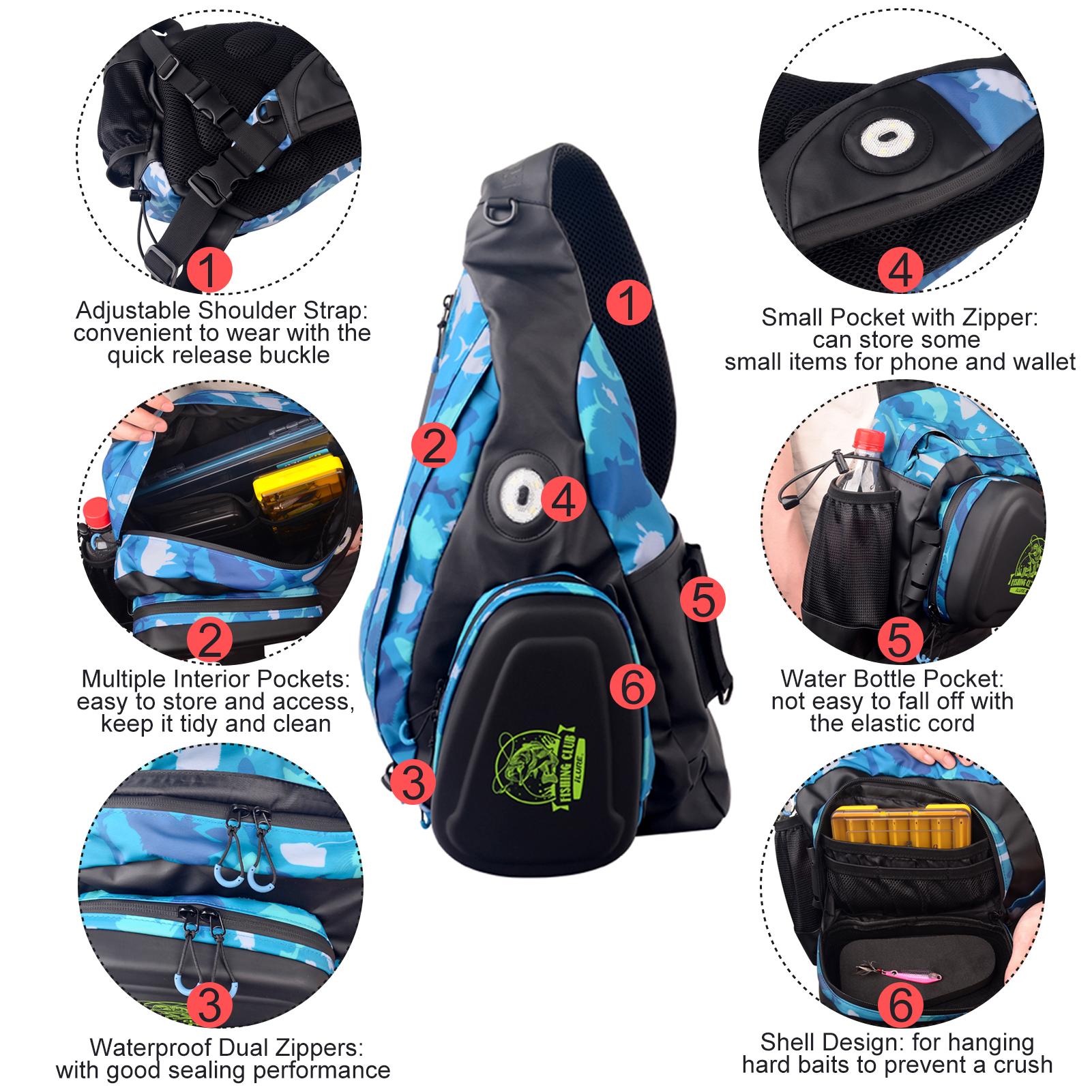 Features: Made of high quality chinlon and nylon material, water-resistant and wear-resistant. Durable PP fishing lure box with split interior space for convenient to storage baits. Adjustable shoulder strap with quick release buckle, convenient and