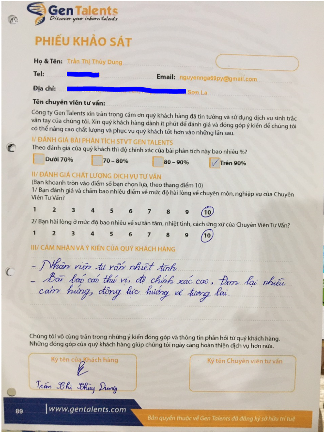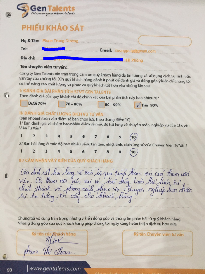 Chúng tôi tự hào là đội ngũ có chất lượng cao về chuyên môn phân tích, tham vấn bài báo cáo sinh trắc vân tay Gentalents được khẳng định bởi sự hài lòng của rất nhiều khách hàng đến từ các tỉnh thành khác nhau trên toàn quốc đã trải nghiệm dịch vụ tư vấn thời gian qua!