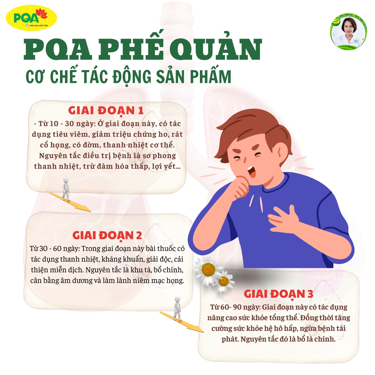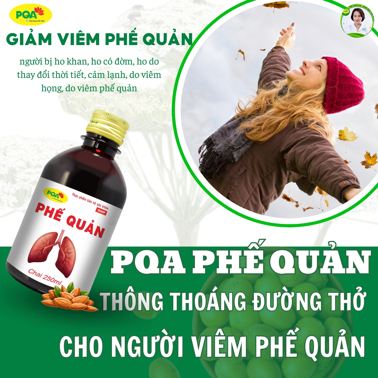 - Đối tượng dùng: Người bị ho khan, ho có đờm, ho do thay đổi thời tiết, cảm lạnh, do viêm họng, viêm phế quản Cách sử dụng Siro PQA Phế Quản chai 125ml Ngày uống 4 lần: sáng, trưa, chiều và trước khi ngủ.