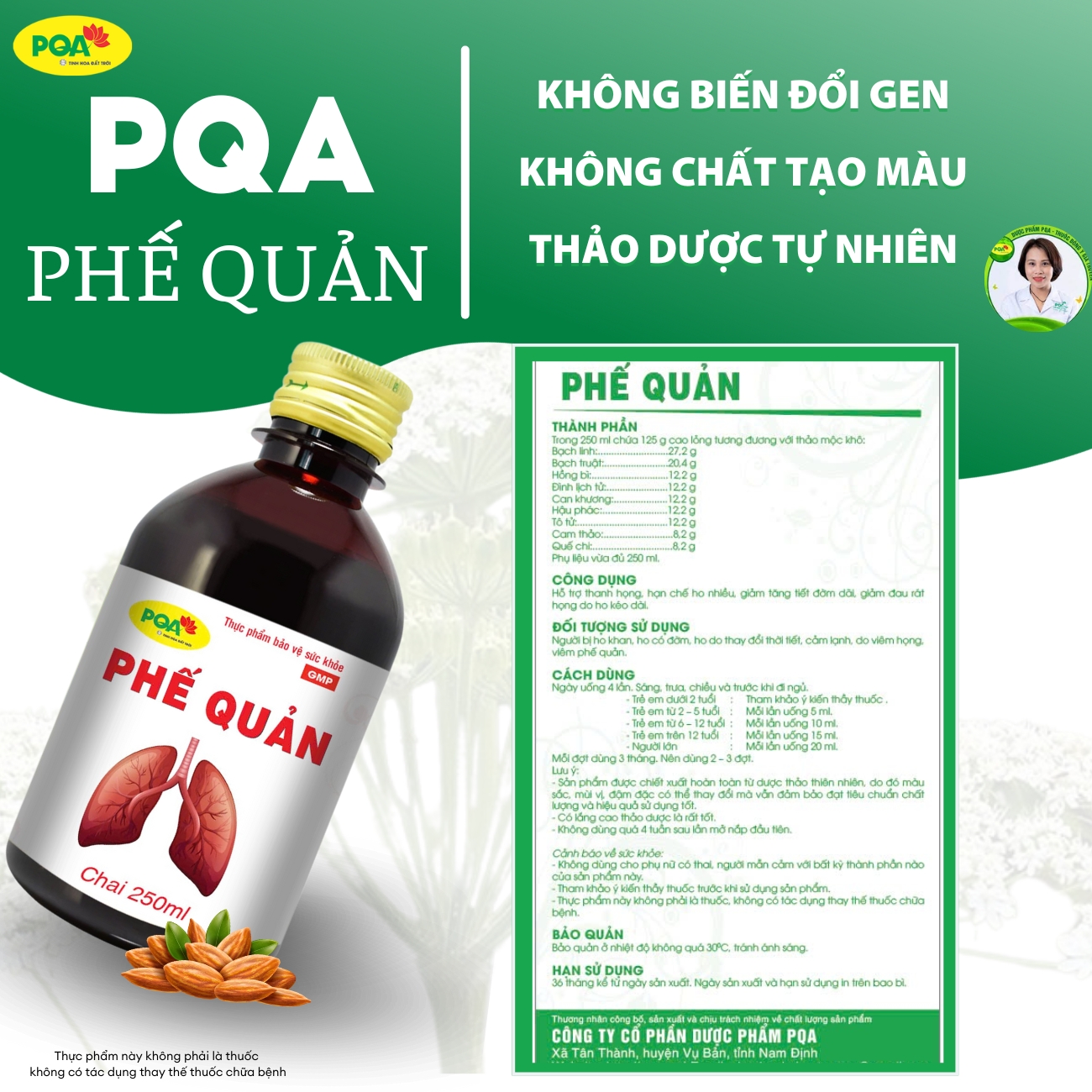 - Phụ liệu: Đường, nipagin, nipasol, nước tinh khiết vừa đủ 125ml. Công dụng & Đối tượng dùng Siro PQA Phế Quản