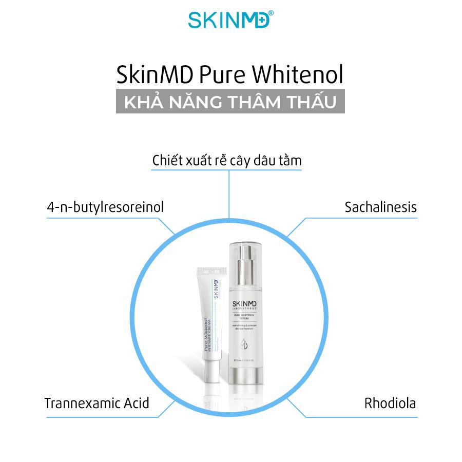 Serum cải thiện ngăn ngừa trắng sáng da và chống lão hóa SkinMD Pure Whitenol Serum Bạn gặp nhiều rắc rối với nám, tàn nhang hoặc thâm sau mụn đang ngày càng trầm trọng hoặc lan rộng trên da? Bạn đã thử qua hàng chục phương pháp & sản phẩm khác nhau nhưng vẫn “tái nám” và da ngày một bào mỏng và nhạy cảm hơn! Hãy để Serum hỗ trợ điều trị nám SkinMD Pure Whitenol Serum giúp bạn giảm thiểu tình trạng thâm, nám, tàn nhang, tái tạo và phục hồi da hư tổn an toàn tuyệt đối ngay tại nhà và nơi làm việc với làn da trắng sáng được cải thiện rõ rệt chỉ sau 1 tháng sử dụng. SkinMD là một thương hiệu dược mỹ phẩm dành riêng cho việc hỗ trợ điều trị chuyên sâu các vấn đề về da có vấn đề về sắc tố dành cho bác sĩ, được phát triển qua hàng trăm nghiên cứu lâm sàng bởi các giáo sư da liễu hàng đầu Hàn Quốc, với công thức y khoa chứng nhận bởi FDA Hoa Kỳ và được công nhận mang hiệu quả đột phá trên toàn thế giới. SkinMD Pure Whitenol Serum có tác dụng ức chế làm giảm sự lan rộng đồng thời tác động trị liệu sâu tận gốc các sắc tố melanin và tyrosinase - 2 nguyên nhân chính của da sạm màu, nám và tàn nhang trong nhiều năm. Thành phần chính và công dụng: