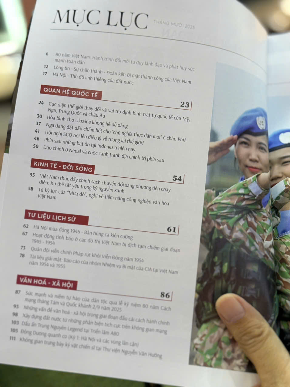 Khép lại số báo, chuyên mục Văn hóa – Xã hội đem đến những góc nhìn đậm bản sắc dân tộc và hơi thở thời đại. Bạn đọc sẽ đọc bài viết về sức mạnh và niềm tự hào dân tộc qua lễ kỷ niệm trọng đại 80 năm Cách mạng tháng Tám; những vấn đề văn hóa – xã hội trong tiến trình cải cách hành chính; cách phản biện xây dựng đất nước trên không gian mạng. Cùng với đó là những điểm nhấn thương hiệu như dấu ấn Trung Nguyên Legend tại Triển lãm A80. Như thường lệ, Tạp chí kết thúc bằng phần giới thiệu không gian trưng bày ký ức chiến sĩ tại Thư viện Nguyễn Văn Hưởng.
