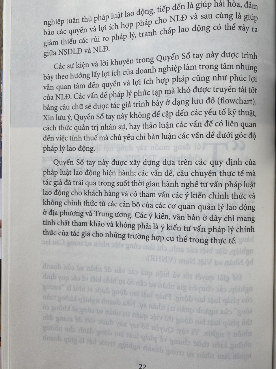 Sổ tay pháp luật lao động này được biên soạn với mong muốn của tác giả là cung cấp những thông tin chính yếu, có tính chất tóm lược và theo một trật tự nhất định dễ theo dõi các quy định của pháp luật lao động Việt Nam. Bên cạnh đó, cuốn Sổ tay này cũng làm rõ một số điểm còn mơ hồ, chưa rõ của các quy định này qua việc phân tích pháp lý và tham khảo ý kiến hướng dẫn của các cơ quan lao động của Việt Nam. Thêm vào đó, Sổ tay cũng liệt kê các yêu cầu báo cáo theo quy định của pháp luật lao động ở từng thời kỳ trong năm mà doanh nghiệp cần theo dõi để thực hiện theo cũng như cung cấp các biểu mẫu báo cáo và các biểu mẫu nhân sự cần thiết khác mà quy định của pháp luật lao động yêu cầu và có cung cấp biểu mẫu hay không cung cấp biểu mẫu. Sổ tay cũng cung cấp lưu đồ (flowchart) các quy trình thực hiện các thủ tục quan trọng có liên quan đến pháp luật lao động trong phạm vi doanh nghiệp.