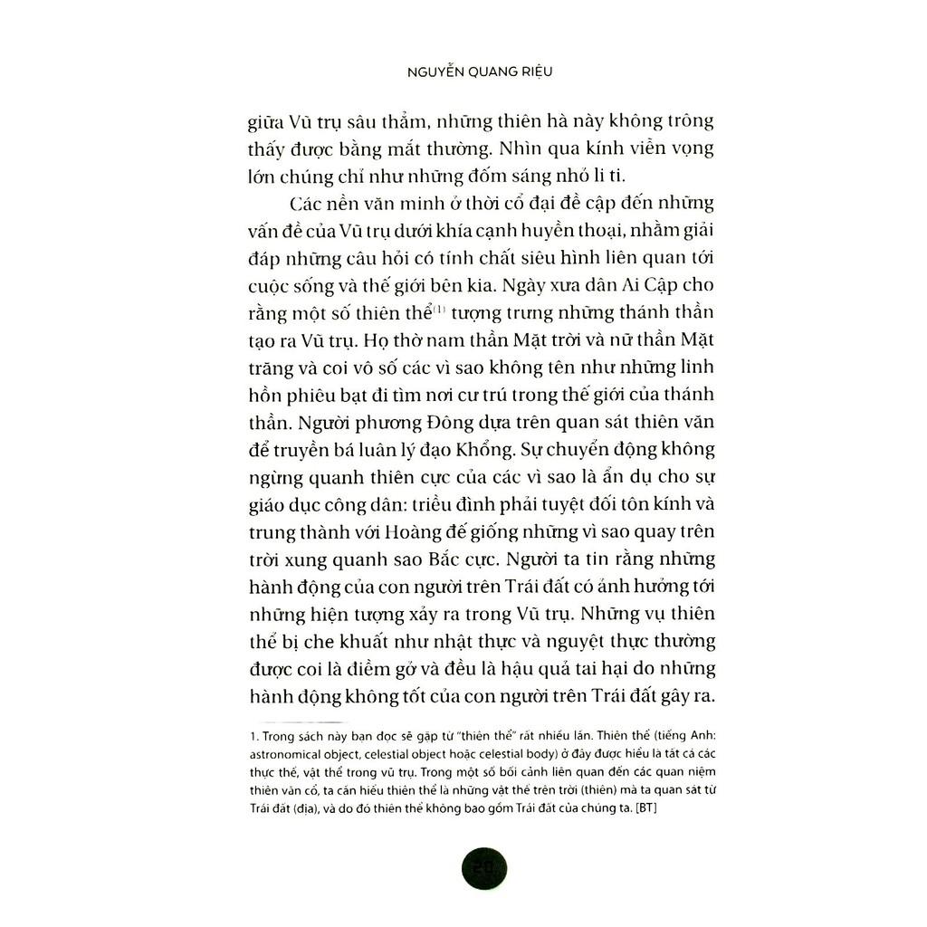 “Thông qua cách sắp xếp độc đáo của cuốn sách, qua việc giảng giải các truyền thuyết hay trình bày một cách sáng sủa những thành tựu mũi nhọn của khoa học, và nhờ việc sưu tầm xuất sắc các hình ảnh minh họa, Nguyễn Quang Riệu đã thực sự hoàn thành một công trình văn hóa. Chúng ta biết ơn ông đã chia sẻ với chúng ta hai nền văn hóa mà ông hấp thụ được.” - Françoise Praderie, Nhà thiên văn tại Đài thiên văn Paris