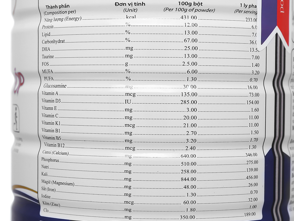 Thành phần: Sữa bột, Maltodextrin, Whey protein, FOS(chất xơ hòa tan), Sữa non, DHA, L-Lysine HCL, Choline, Taurine, Vitamin ( Vitamin A, Vitamin D3, Vitamin E, Vitamin K1, Vitamin C, Vitamin B1, Vitamin B2,