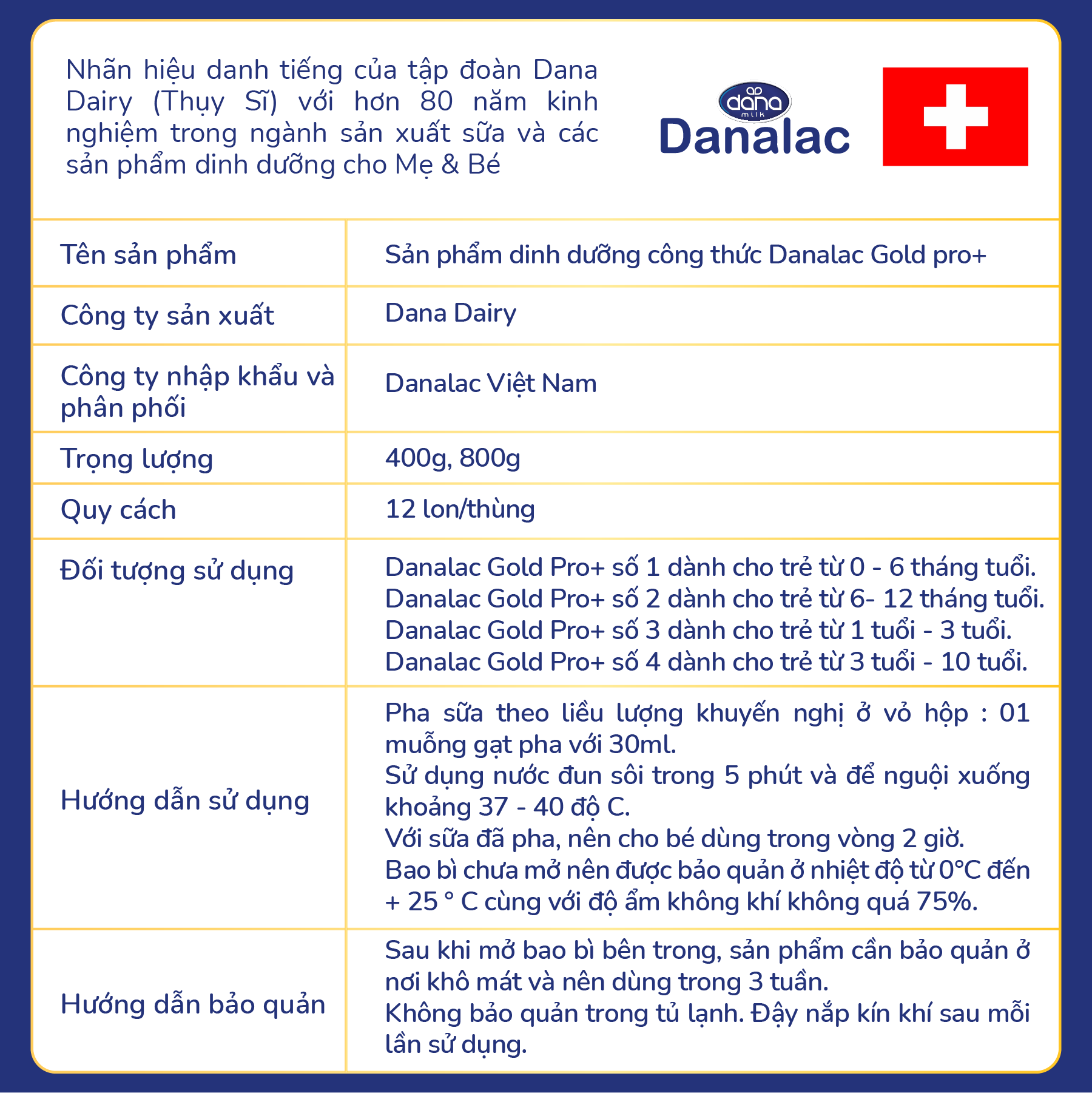 DANALAC GOLD pro+ là nhãn hiệu sữa bột danh tiếng được phát triển bởi tập đoàn Dana Dairy (Thụy Sĩ) với hơn 80 năm kinh nghiệm trong lĩnh vực sản xuất các sản phẩm dinh dưỡng cho trẻ sơ sinh và trẻ nhỏ. THÔNG TIN SẢN PHẨM