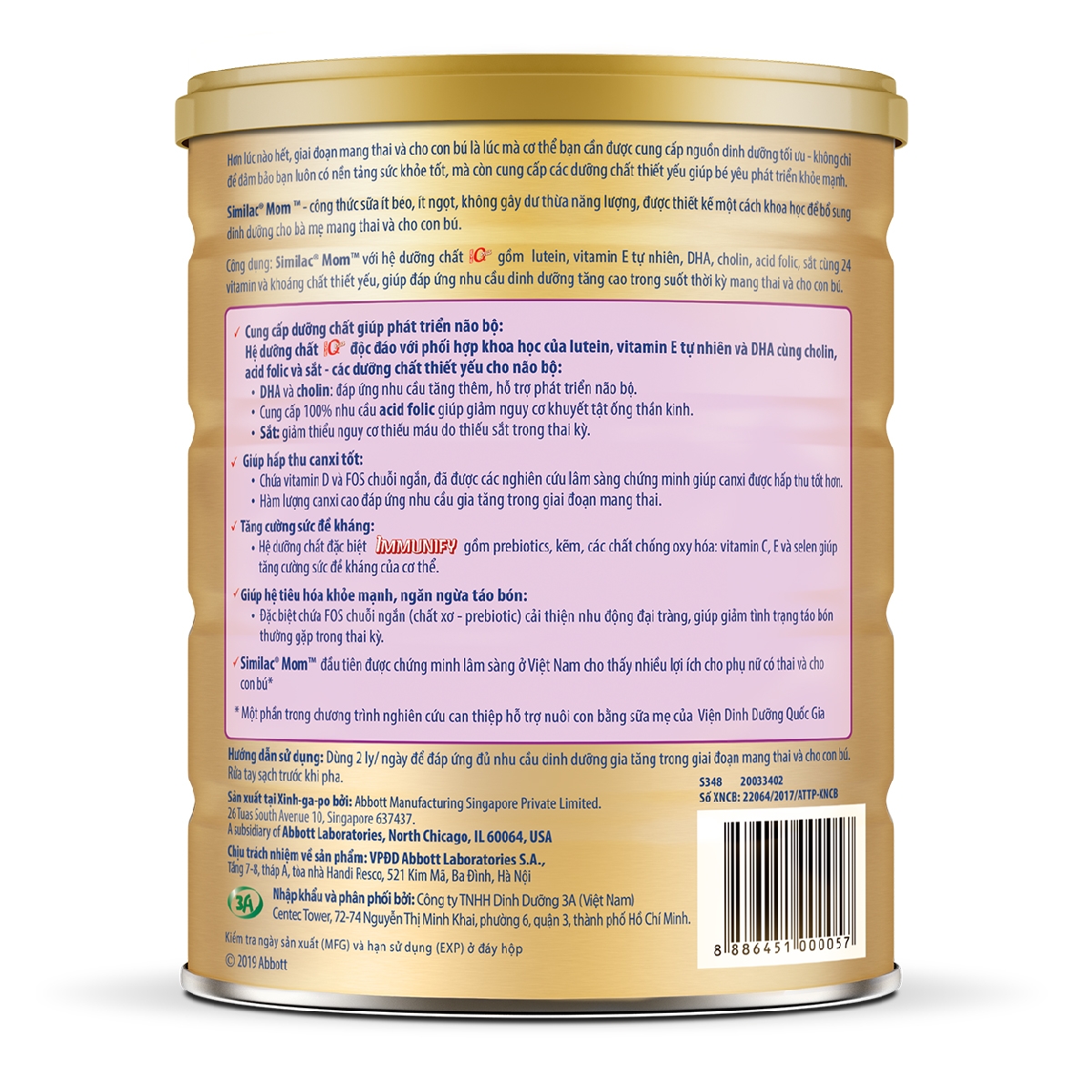 - Giúp hệ tiêu hóa khỏe mạnh, ngăn ngừa táo bón Sản phẩm này là sữa dành cho bà mẹ mang thai và cho con bú đặc biệt chứa FOS chuỗi ngắn (chất xơ - prebiotic) cải thiện nhu động đại tràng, giúp giảm tình trạng táo bón thường gặp trong thai kỳ.