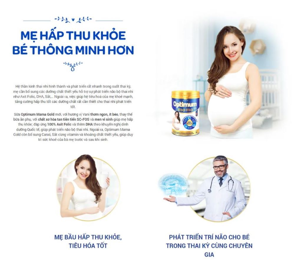 - Sữa cho mẹ và bé Optimum Mama Gold có thể xem là một lựa chọn hợp lý, tốt nhất vì có công thức Opti-Immune giúp tăng cường sức khỏe hệ tiêu hóa & đề kháng cho mẹ, cung cấp đầy đủ các dưỡng chất thiết yếu đáp ứng nhu cầu dinh dưỡng tăng cao trong thời kỳ mang thai và cho con bú; giúp mẹ khoẻ mạnh thoải mái, từ đó tạo nền tảng cho sự phát triển toàn diện của bé. Thành Phần Sữa từ 100% sữa tươi (96%), đường (3,8%), chất ổn định (471, 460(i), 407, 466), vitamin (A, D3), khoáng chất (natri selenit/ sodium selenite). Hướng dẫn sử dụng Bước 1: Cho 5 muỗng gạt ngang (khoảng 43 g) Optimum Mama Gold vào 190 ml nước đun sôi để nguội (khoảng 50°C). Bước 2: Khuấy đều cho đến khi bột tan hoàn toàn. Hướng dẫn bảo quản Đậy kín sau mỗi lần sử dụng. Để nơi thoáng mát và khô ráo. Không bảo quản trong tủ lạnh. Sử dụng trong vòng 4 tuần sau khi mở bao bì. Quy cách đóng gói