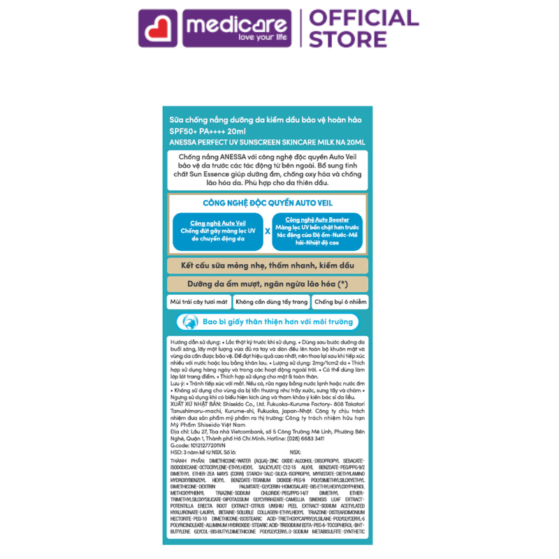 Mua tại TiktokQuy cách đóng gói: Hộp - 1 chai x 20ml. Nhà sản xuất/Nhà phân phối: CÔNG TY TNHH MỸ PHẨM SHISEIDO VIỆT NAM CÔNG DỤNG: Công nghệ độc quyền Auto Veil: Bảo vệ da trước mọi tác động nhờ chống đứt gãy màng lọc UV do chuyển động da của biểu cảm gương mặt. Chống mất nước 8H, chống oxy hóa và chống lão hóa, gia tăng khả năng kháng nắng tự nhiên của làn da. Chống bụi mịn PM2.5 và chống cát. Dưỡng ẩm, mát mịn và nhẹ giúp duy trì độ ẩm lên đến 8 giờ. Có thể sử dụng như kem lót trang điểm và dễ dàng làm sạch bằng sữa rửa mặt. Cách dùng: Thoa trực tiếp lên vùng da cần bảo vệ. Dùng cho mặt và body. Thích hợp sử dụng hằng ngày và trong các hoạt động ngoài trời. Có thể thoa lại sau mỗi 4 giờ khi tiếp xúc với nước như bơi lội. Thành phần: