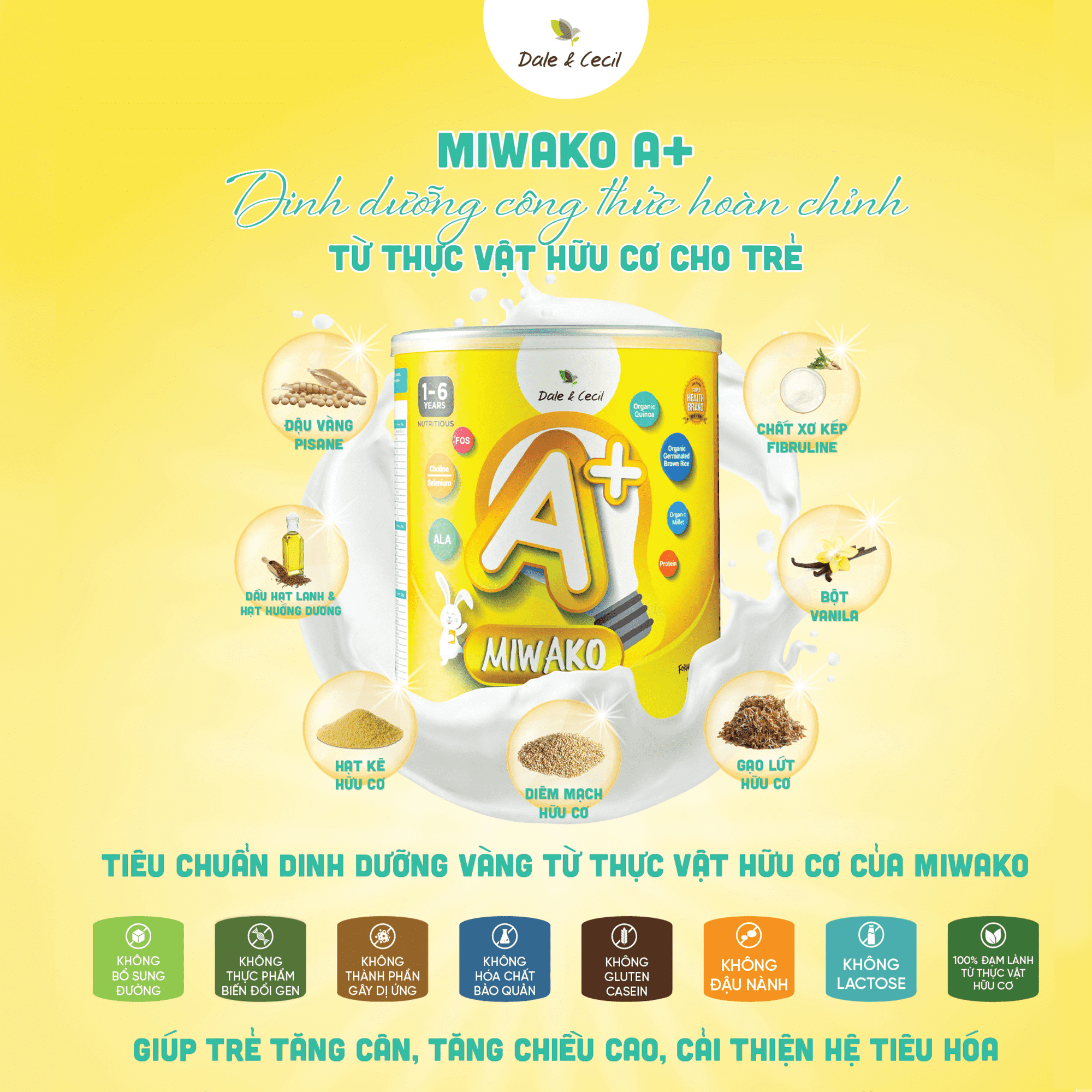 - Với đầy đủ các vi chất quan trọng tốt cho sự phát chiều cao, sữa Miwako A+ tự tin đồng hành cùng con khôn lớn. Bổ sung 3 ly Miwako A+ mỗi ngày sẽ là nguồn dinh dưỡng cân đối với các vi chất thiết yếu giúp em bé phát triển chiều cao tối đa.