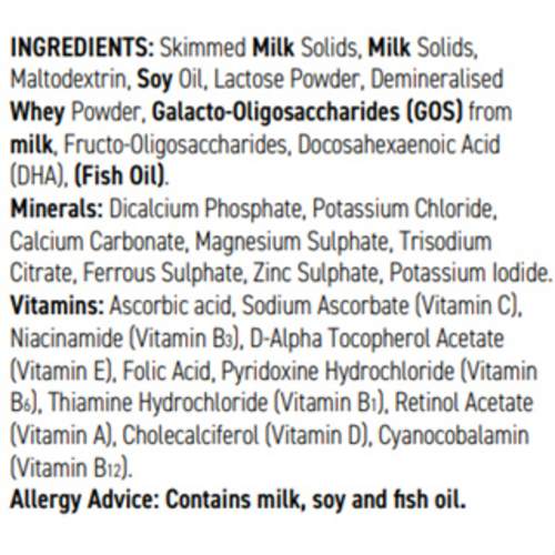 - Thành phần: Sữa đặc tách béo, Sữa đặc, Maltodextrin, Dầu đậu nành, Bột Lactose, Bột whey khử khoáng, Galacto-Oilgosaccharide (GOS) từ sữa, Fructo-oligosaccharide (FOS), Acid docosahexaenoic (DHA), (dầu cá). Các khoáng chất: Dicalci phosphat, Kali clorid, Calci carbonat, magnesi sulphat, trinatri citrat, sắt sulphat, kẽm sulfat, kali iodid. Các vitamin: Acid ascorbic, Natri ascorbat (vitamin C), Niacinamide (Vitamin B3), D-alpha tocopheryl acetat (Vitamin E), Acid folic, Pyridoxin hydroclorid (Vitamin B6), Thiamin hydroclorid (Vitamin B1), Retinyl acetat (Vitamin A), Cholecalciferol (Vitamin D), Cyanocobalamin (Vitamin B12).