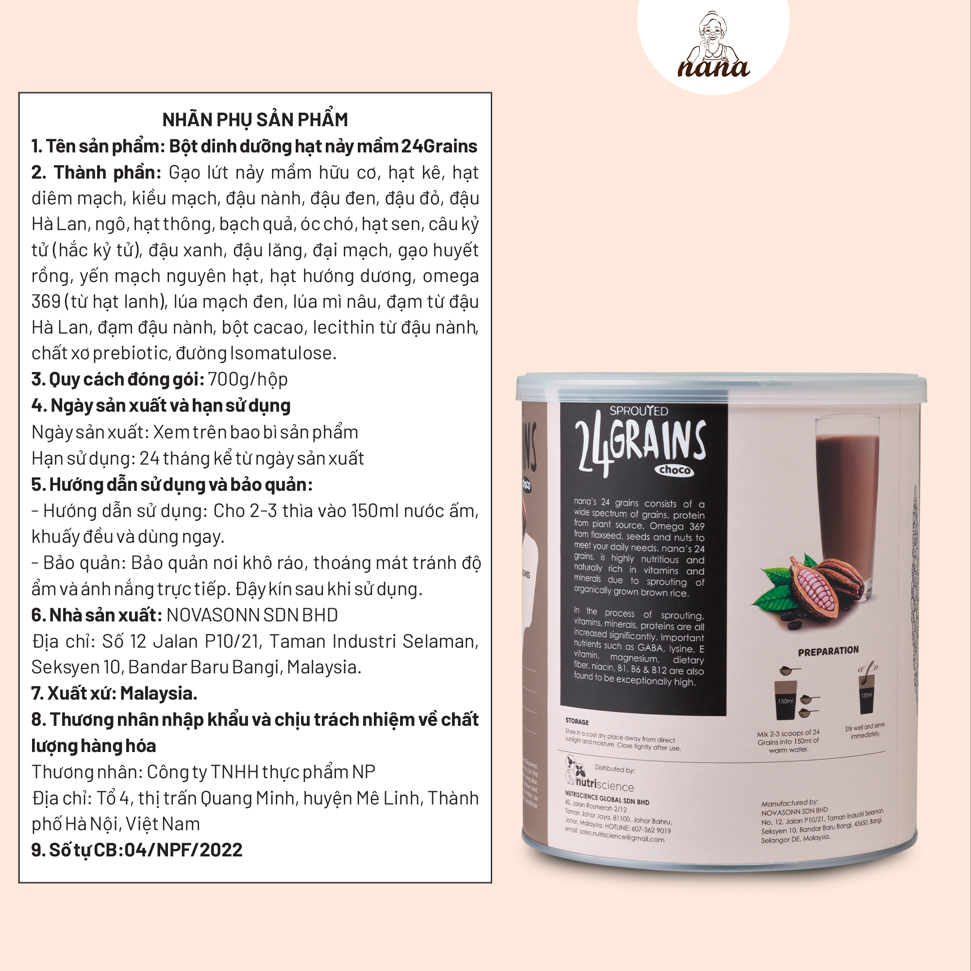 - Thành phần: Gạo lứt hữu cơ nảy mầm, hạt kê, hạt diêm mạch, kiều mạch, đậu đen, đậu đỏ, ngô, hạt thông, bạch quả, óc chó, hạt sen, câu kỷ tử, đậu xanh, đậu lăng, đại mạch, gạo huyết rồng, yến mạch nguyên hạt, hạt hướng dương, omega 369 (từ hạt lanh), lúa mạch đen, lúa mì nâu, protein từ đậu Hà Lan, bột cacao, lecithin từ đậu nành, chất xơ prebiotic, isomaltulose. SP của OMEGA HEALTH PRODUCTS SDN BHD NSX: NOVASONN SDN BHD MALAYSIA NK&PP tại VN: CÔNG TY TNHH THỰC PHẨM NP 3 THÀNH PHẦN CHÍNH TỰ NHIÊN CỦA 24GRAINS:
