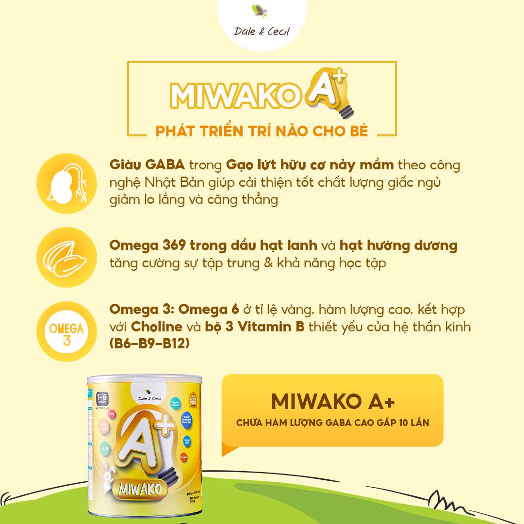 Sữa Công Thức Thực Vật Hữu Cơ Miwako A+ Hộp 400g - Vị Vani - Giúp Giấc Ngủ Ngon, Cải Thiện Hệ Tiêu Hóa  Sữa Miwako A+ được sản xuất bởi Dale & Cecil thông qua những tiêu chuẩn khắt khe: Chứng chỉ Hữu cơ USDA Organic (của bộ Nông nghiệp Mỹ cho các sp có trên 95% thành phần hữu cơ và được tổ chức này theo dõi liên tục quá trình từ sản xuất nguyên liệu thô đến sp cuối cùng). Chứng nhận hữu cơ Châu Âu (Organic EU) tuân thủ quy trình sản xuất thực phẩm bền vững từ đất đai cân bằng và màu mỡ. NON-GMO (Non – Genetically Modified Organism) – Không biến đổi gen. Sản phẩm đạt tiêu chuẩn Non – GMO nghĩa là sản phẩm đó được sản xuất từ 100 % nguyên liệu tự nhiên, tinh khiết, không chứa thành phần biến đổi gen và đảm bảo an toàn cho sức khỏe người sử dụng. Thành Phần: Protein hạt đậu, Hạt diêm mạch, Hạt kê, Gạo lứt, Gạo lứt nảy mầm, Bột đậu vani, Inulin, Khoáng chất (Canxi cacbonat, Choline bitartrate, Magie sulfat, Ferrous sulphat, Kẽm sulfat, Kali iodua, Natri selente), Vitamin (Axit Ascorbic, Niacinamide, Vitamin E acetate, D-calcium pantothenate, Cyanocobalamin, Pyridoxine HCL, Riboflavin, Thiamine HCL, Vitamin A palmitate, Folic acid, Phylloquinone, D-biotin, Cholecalciferol), Fructooligosacharides (FOS), Dầu hướng dương và Dầu hạt lanh. Không thêm gluten, lúa mì, sữa, đậu phộng, đậu nành, chất bảo quản, phẩm màu nhân tạo và hương liệu nhân tạo.     ĐỐI TƯỢNG SỬ DỤNG SỮA CÔNG THỨC MIWAKO A+