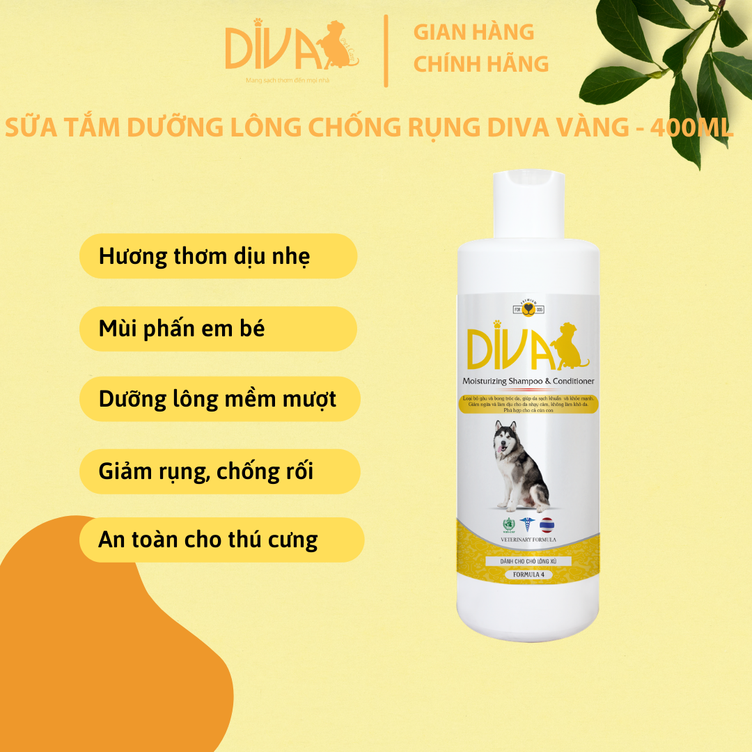 • Sữa tắm dưỡng ẩm khử mùi Diva vàng có tác dụng dưỡng da mềmmại và giảm rụng lông. Giúp lưu lại hương thơm lâu dài cho cún yêu.
