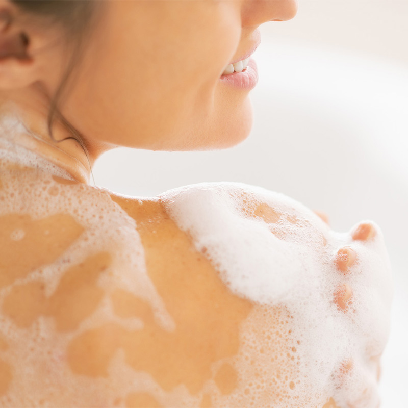 Lấy một lượng sữa tắm vừa đủ ra lòng bàn tay hoặc bông tắm, tạo bọt