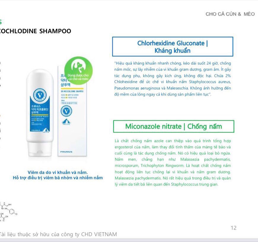 THÀNH PHẦN: Trong 1ml có chứa: Chlorhexidine digluconate 31,2 mg Dung môi vừa đủ 1 ml CÔNG DỤNG: Phòng tr.ị các bệnh xảy ra thường xuyên trên da lông như: nấm da, viêm nang lông,