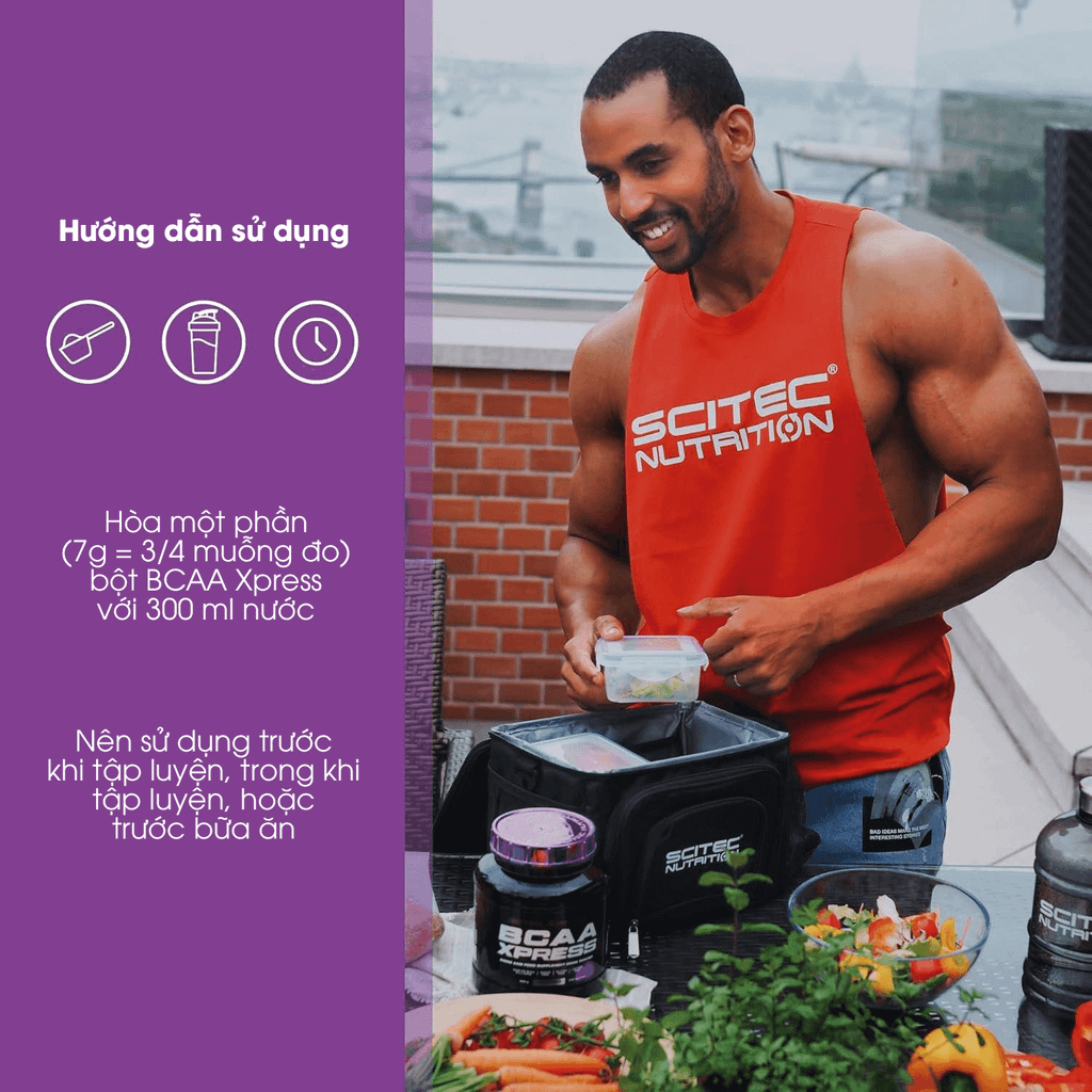 - Thương hiệu Scitec Nutrition uy tín Scitec Nutrition BCAA Xpress (Sữa Tăng Hiệu Suất Scitec BCAA Xpress) là sản phẩm bổ sung () dạng bột uống, giúp cung cấp chuỗi amino BCAA hỗ trợ tăng cơ và phục hồi cơ bắp hiệu quả. Sản phẩm này đến từ thương hiệu Scitec Nutrition, một hãng thực phẩm bổ sung hàng đầu châu Âu với hơn 25 năm kinh nghiệm trong lĩnh vực dinh dưỡng thể thao. BCAA Xpress hoàn toàn không chứa đường, không gluten, không lactose nên phù hợp cho nhiều đối tượng tập luyện. Giới thiệu Sữa Tăng Hiệu Suất Scitec Bcaa Xpress Scitec Nutrition BCAA Xpress là sản phẩm bổ sung BCAA dạng bột uống được thiết kế nhằm tăng cường hiệu suất tập luyện và phục hồi cơ bắp. Scitec Nutrition là thương hiệu uy tín, đã khẳng định tên tuổi trên thị trường thực phẩm bổ sung tại châu Âu và toàn cầu. Với dây chuyền sản xuất hiện đại và kinh nghiệm dày dặn, Scitec luôn đảm bảo chất lượng và độ tinh khiết của các sản phẩm bổ sung dinh dưỡng. BCAA Xpress chính là một trong những sản phẩm chủ lực của hãng, cung cấp nguồn BCAA tinh khiết theo tỷ lệ chuẩn để đáp ứng nhu cầu của người tập gym và vận động viên chuyên nghiệp. BCAA Xpress nổi bật với công thức 7g BCAA mỗi khẩu phần theo (Leucine : Isoleucine : Valine) – đây là tỷ lệ đã được khoa học chứng minh là tối ưu nhất để BCAA phát huy hiệu quả cho cơ bắp Điều này đồng nghĩa với việc mỗi muỗng 7g bột BCAA Xpress cung cấp 5,000mg BCAA, trong đó khoảng 2.5g Leucine, 1.25g Isoleucine, 1.25g Valine. Nhờ tỷ lệ leucine cao gấp đôi hai amino còn lại, sản phẩm kích thích mạnh mẽ quá trình tổng hợp protein và xây dựng cơ bắp. Không chỉ chú trọng hàm lượng, Scitec còn đảm bảo thành phần sạch: BCAA Xpress không chứa đường, không gluten, không lactose – phù hợp cho người ăn kiêng đường, người không dung nạp gluten hay lactose. Sản phẩm cũng không chứa chất kích thích hay phụ gia độc hại, công thức minh bạch để người dùng an tâm sử dụng. Bột BCAA Xpress được xử lý phân tách (instantized) giúp hòa tan nhanh chóng trong nước, thuận tiện pha uống trong lúc tập. Ưu điểm của Scitec BCAA Xpress