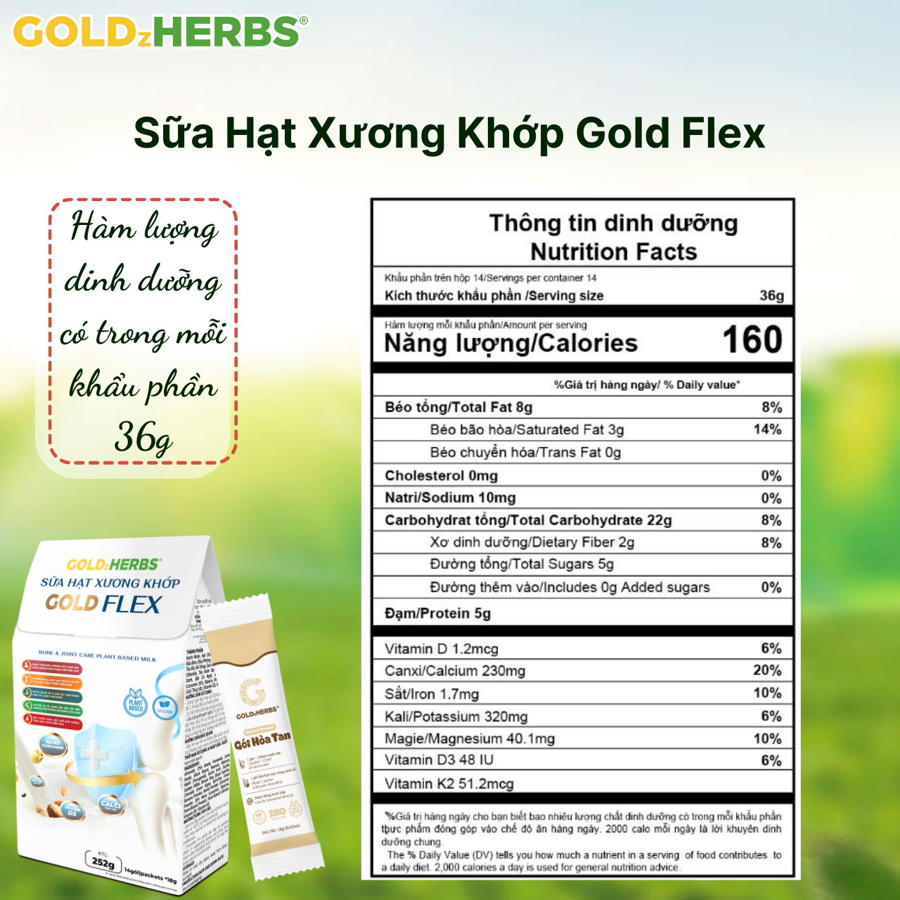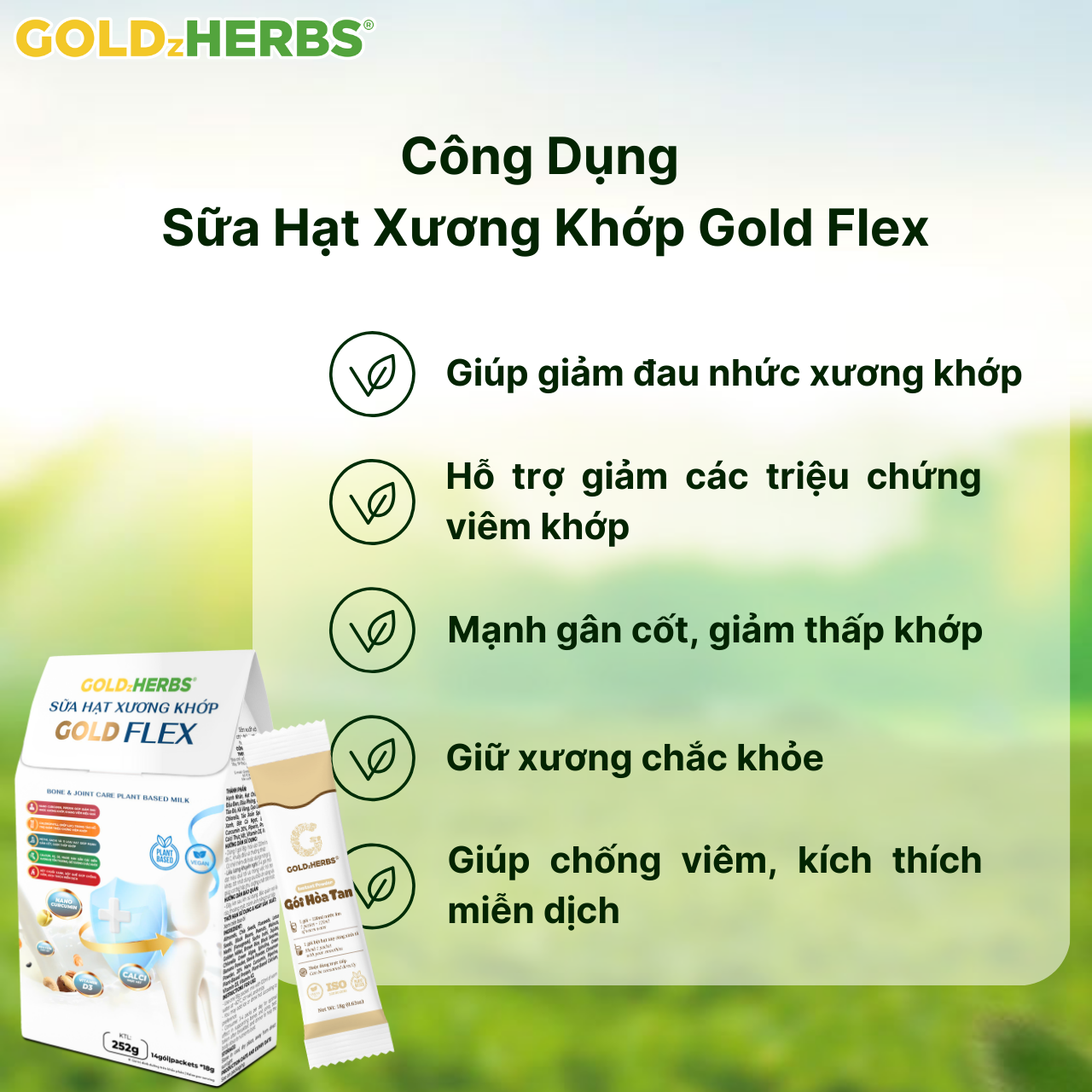 Sữa thực vật xương khớp Gold Flex CÔNG DỤNG - Tăng cường sức khỏe xương khớp. - Cung cấp canxi, giảm loãng xương. - Hỗ trợ kháng viêm, giảm đau. - Cải thiện linh hoạt