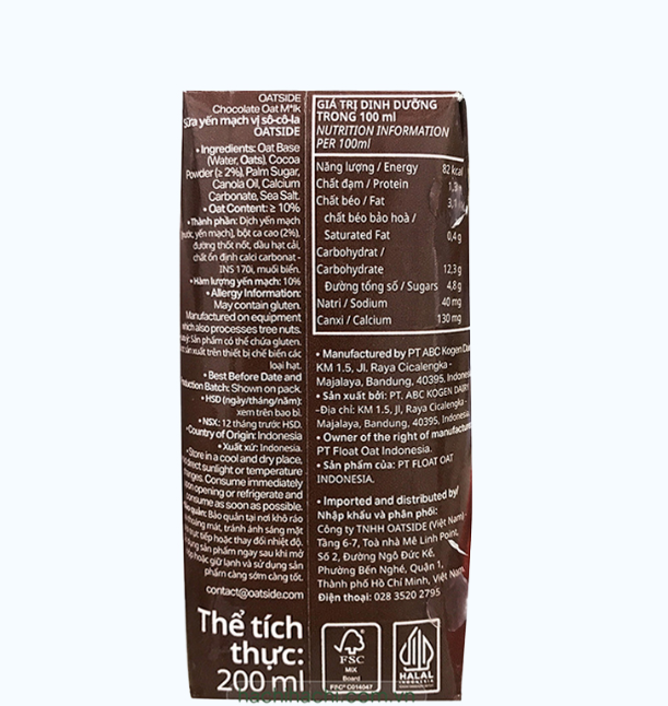 Mua tại TiktokThành phần Dịch yến mạch, bột cacao, đường thốt nốt, dầu hạt cải, chất ổn định,... Đối tượng sử dụng Trẻ từ trên 1 tuổi & người lớn Bổ sung dinh dưỡng & năng lượng hằng ngày. Cách sử dụng Lắc đều trước khi sử dụng, ngon hơn khi uống lạnh & có thể sử dụng trong pha chế.