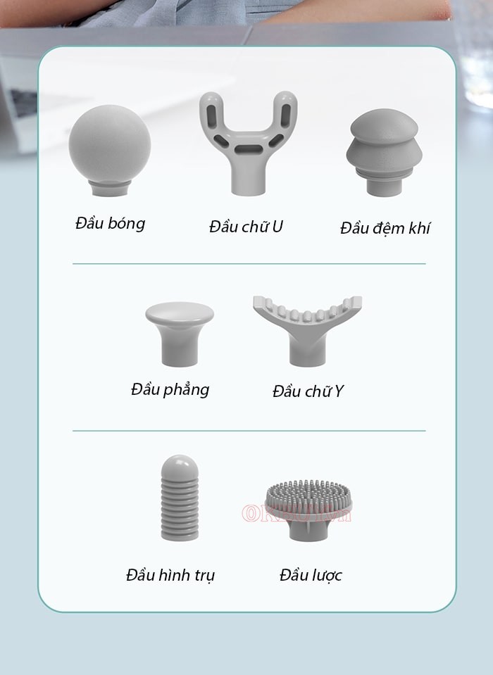 7 đầu massage được thiết kế chuyên nghiệp mô phỏng nhiều kỹ thuật massage khác nhau. Mỗi đầu có một kiểu dáng khác nhau giúp chúng thích ứng tốt với từng nhóm cơ trên cơ thể. Sự đa dạng của tốc độ massage kết hợp cùng sự phong phú của đầu massage sẽ đem đến cho người dùng nhiều trải nghiệm massage tuyệt vời.