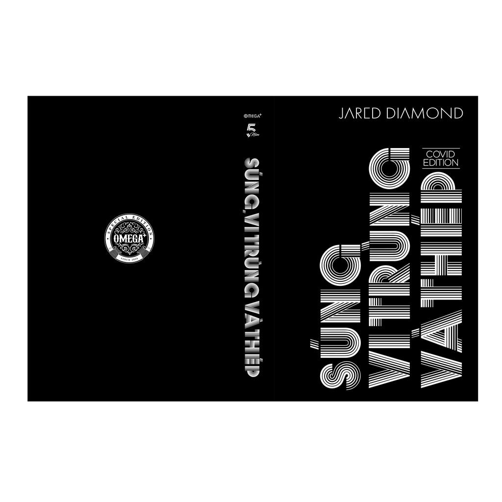 Gáy tròn, bìa cứng bọc vải, nền đen ép nhũ kim chữ “Súng, vi trùng và thép”, dập chìm tinh tế, sang trọng, có in dấu ấn phiên bản Covid Edition, bìa sau in logo bản đặc biệt Omega+.