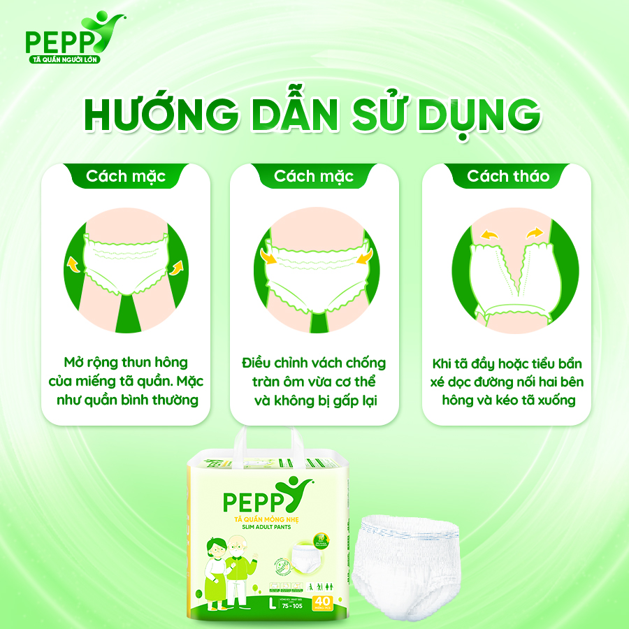 - Công nghệ màng thở nano: Mặt đáy được làm từ vải thở thoáng khí, thoát hơi ẩm đa chiều qua những lô siêu nhỏ giúp làn da bé luôn được hô hấp với không khí tự nhiên, giảm hầm bí, hăm tã. III. HƯỚNG DẪN SỬ DỤNG Bước 1: Mẹ hãy luồn tay từ phía dưới tã và nhẹ nhàng xỏ hai chân bé vào hai ống quần của tã. Sau đó kéo tã lên trên rốn. Bước 2: Kéo đai lưng, điều chỉnh vách ngăn chống tràn. Bước 3: Thay tã sau 3-4h sử dụng hoặc sau khi tã bị vấy bẩn. Bước 4: Bỏ tã vào sọt rác. Lưu ý: không được bỏ tã vào bồn vệ sinh