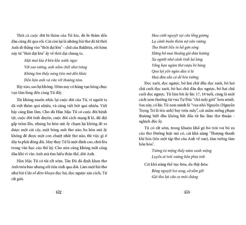 “Thơ Hàn Mặc Tử đi từ trong sáng đến đau thương, bay lên thượng tầng đớn đau chết chóc, rồi trở lại những tinh khiết ban đầu như chưa bao giờ bợn gợn những vật vã kinh hoàng trần thế. Thơ đi cùng Hàn từ thơ ấu đến dậy thì, thành niên với những say mê đắm đuối, rồi thơ mắc bạo bệnh về cõi chết cùng Hàn. Nhưng ở những giây phút khắc nghiệt nhất, hoang loạn nhất, vẫn có hai Hàn, hai thơ: một Hàn của mộng đẹp khi cơn đau lắng xuống và một Hàn của mộng dữ khi cơn đau dấy lên cực điểm