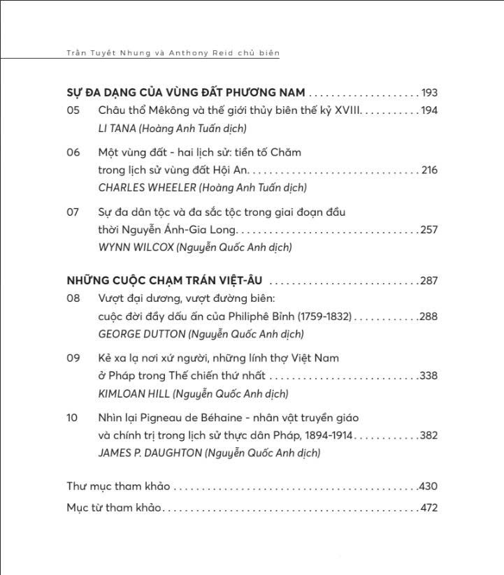 Cuốn sách gồm nhiều chương chuyên đề sâu sắc, từ thời kỳ tiền hiện đại cho đến cận đại, phản ánh sự ảnh hưởng lẫn nhau giữa Việt Nam và các nền văn hóa lân cận như Trung Hoa, Đông Nam Á, Ấn Độ và phương Tây. Thông qua các câu chuyện như hành trình của Philippé Bỉnh – người Việt đầu tiên đối thoại với châu Âu – hay các dòng di cư và truyền bá tôn giáo, tác phẩm cho thấy bản sắc Việt Nam được hình thành trong quá trình tương tác và tiếp biến không ngừng.