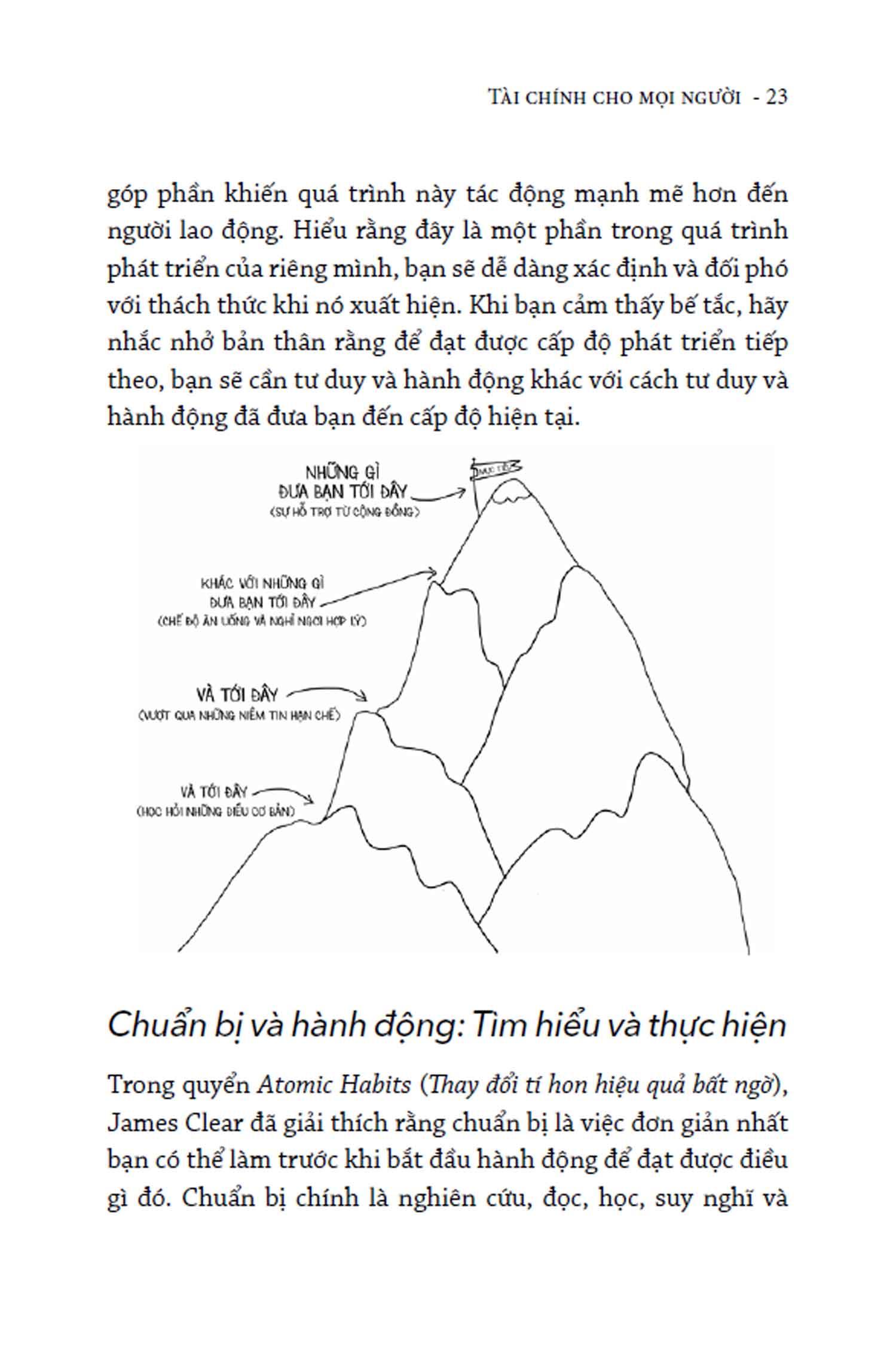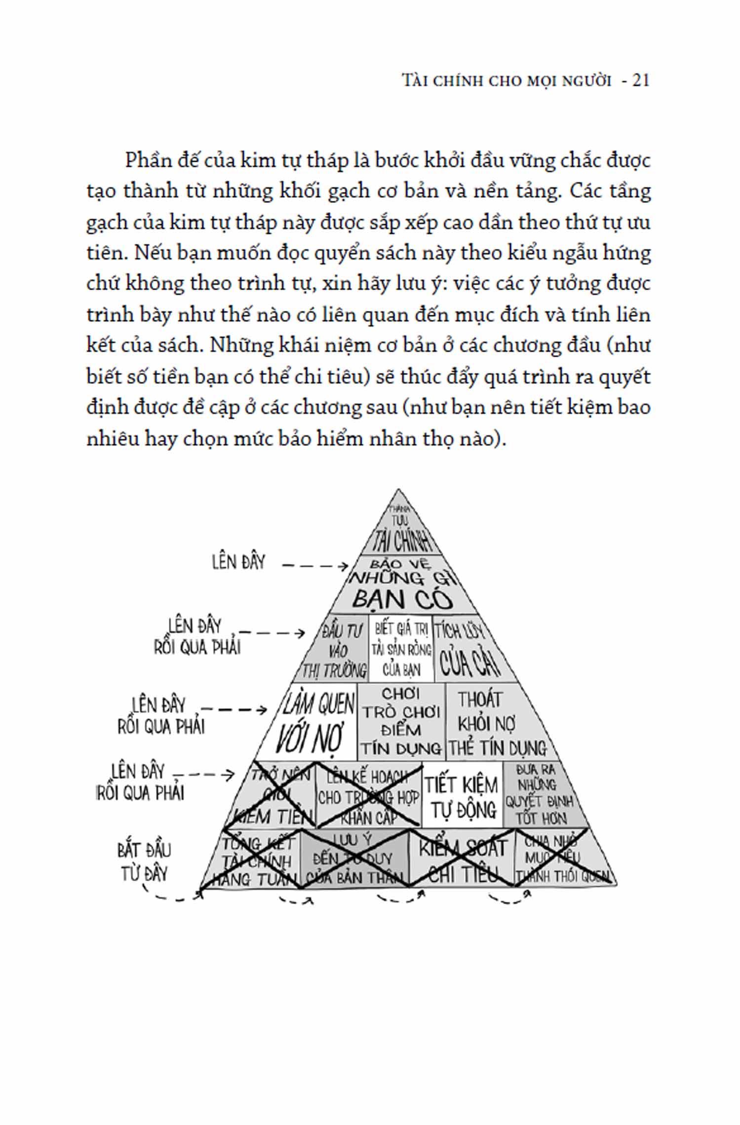 Sách được chia thành 5 phần, mỗi phần tương ứng với một “tầng gạch” trong kim tự tháp tài chính cá nhân, cái mà mỗi người cần chinh phục theo thứ tự từ cơ bản đến nâng cao để đạt đến “đỉnh” thành tựu tài chính.