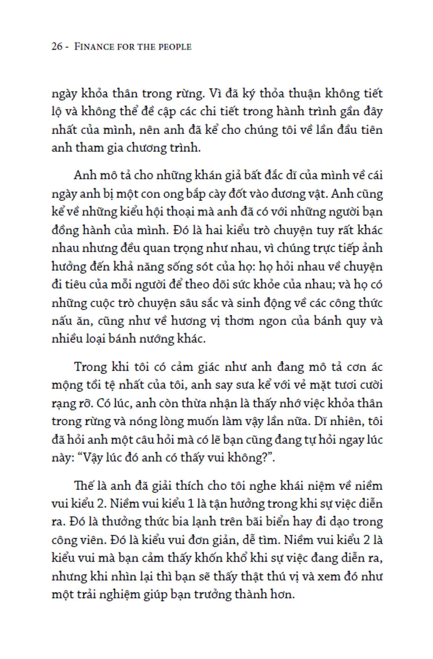 Bên cạnh nhiều thông tin bổ ích, “Tài chính cho mọi người” còn cung cấp những hình vẽ trực quan, dễ hiểu và dí dỏm. Tác giả cũng thường dùng những hình ảnh so sánh thú vị – từ ly cocktail, khu vườn, đến trò bowling – để lý giải các khái niệm và công cụ tài chính rối rắm. Những bài thực hành và câu hỏi cuối mỗi chương giúp độc giả nhìn lại chính m.ình và theo dõi quá trình tiến bộ của bản thân.
