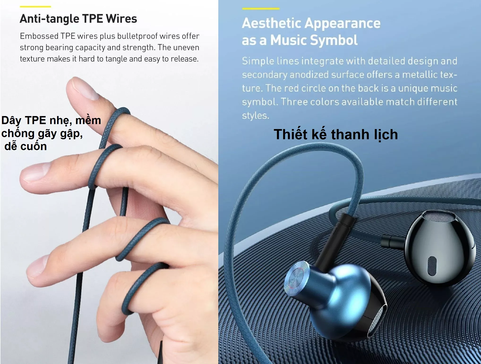 - Nếu bạn đang tìm cho mình một chiếc tai nghe thời trang, vừa có khả năng đáp ứng tốt nhu cầu nghe gọi to rỏ vừa có khả năng mang đến những trải nghiệm âm nhạc sống động và với giá thành siêu hợp lý thì đó chỉ có thể là tai nghe Baseus Encok H19 . Một chiếc tai nghe cơ bản với Jack Audio AUX3.5mm phổ thông nhưng lại mang trong mình một chất âm sống động đến bất ngờ với hiệu ứng 6D hifi Surround. - Tai nghe có dây Baseus Encok H19 là mẫu tai nghe cao cấp có housing làm bằng nhôm siêu nhẹ, kiểu dáng khớp với khuôn tai cho hiệu quả cách âm, chống ồn cực tốt, không gây áp lực lên khuôn tai và vành tai tạo cảm giác thoải mái khi đeo. Bạn có thể đeo tai nghe Baseus Encok H19 để thưởng thức âm nhạc hàng giờ liền mà không gây đau tai .