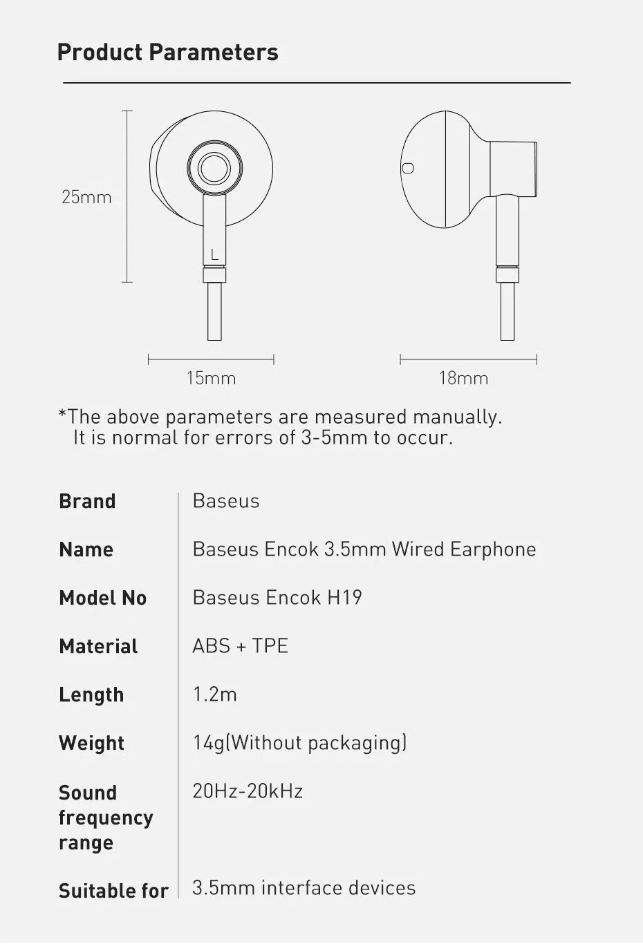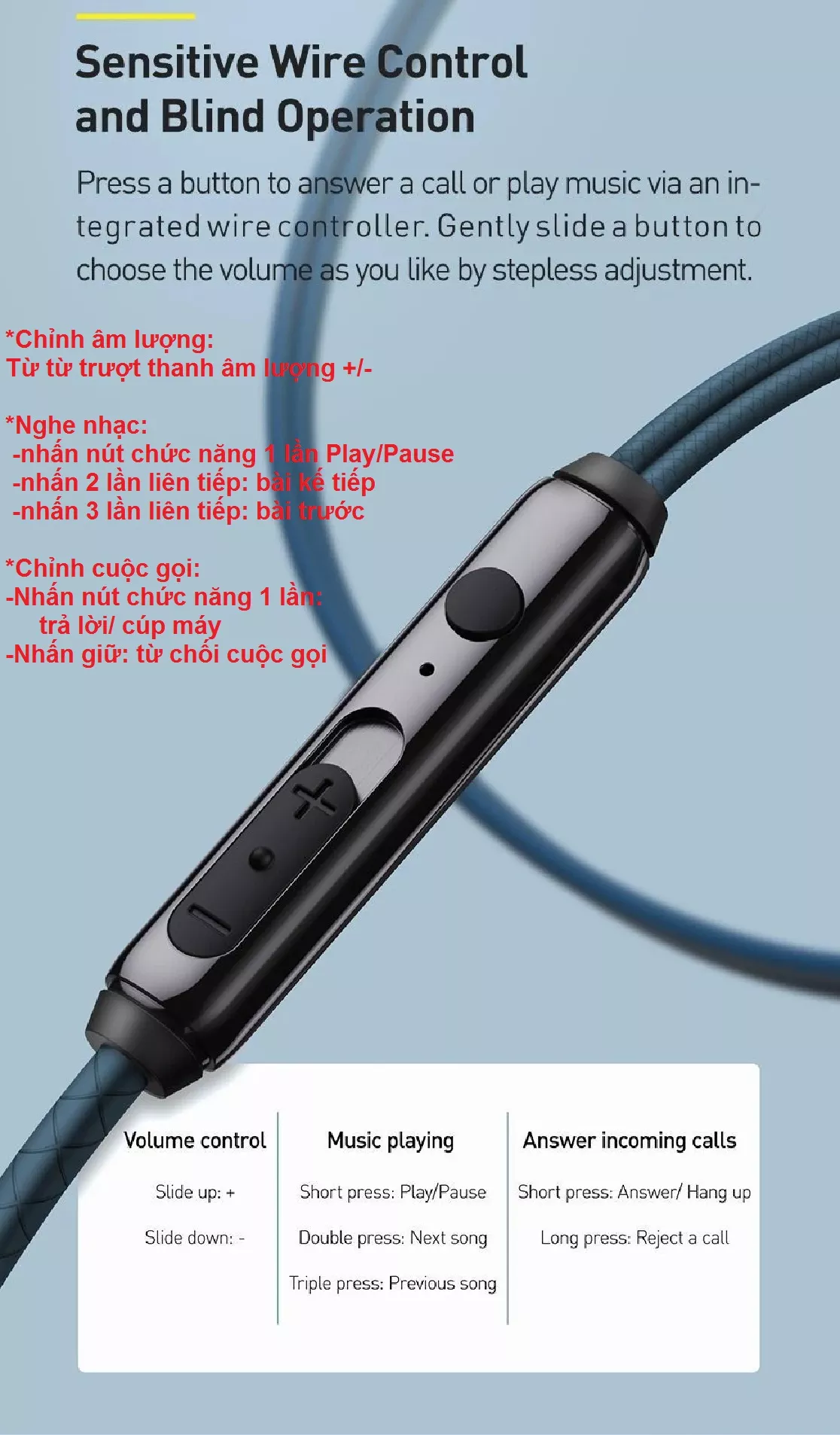 * Thương hiệu: BASEUS - Phong cách: Tai nghe - Xuất xứ: CN (Xuất xứ) - Nút điều khiển: Có - Khử ồn chủ động: Không - Giao tiếp: Có dây - Kiểm soát âm