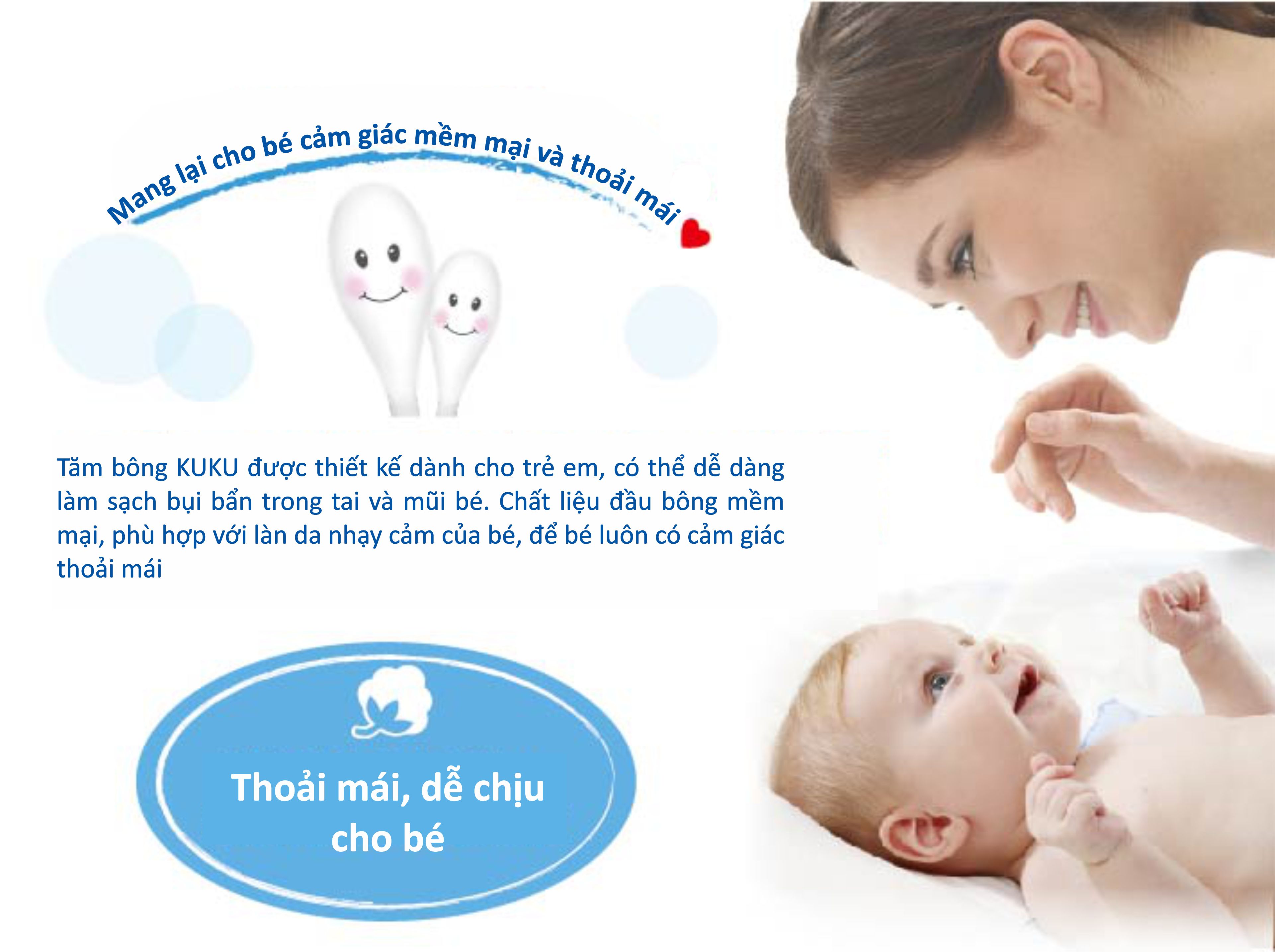 Tăm Bông Vệ Sinh Cho Bé KUKU KU1104 - 60 Cái làm bằng chất liệu cotton cao cấp, mềm mại, thấm hút nhanh chóng giúp vệ sinh tai, rốn... hiệu quả, không gây tổn thương bé.