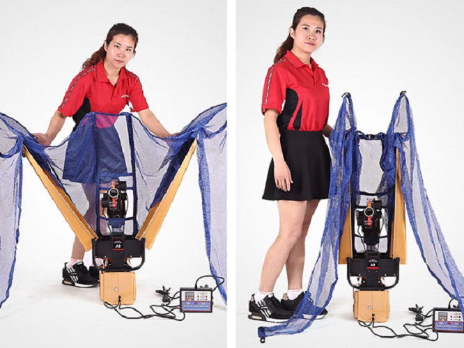- được thiết kế dạng gắn với mặt bàn khi lắp đặt giúp tiết kiệm diện tích và người chơi sẽ ít phải đi nhặt bóng hơn khi sử dụng tập luyện. Sản phẩm còn có bộ lưới thu bóng đi kèm rất tiện dụng và có bộ điều khiển từ xa giúp điều chỉnh tốc độ, độ xoáy và hướng bắn bóng rất dễ dàng. Ngoài ra, máy cũng có thể gập gọn vào sau khi sử dụng.