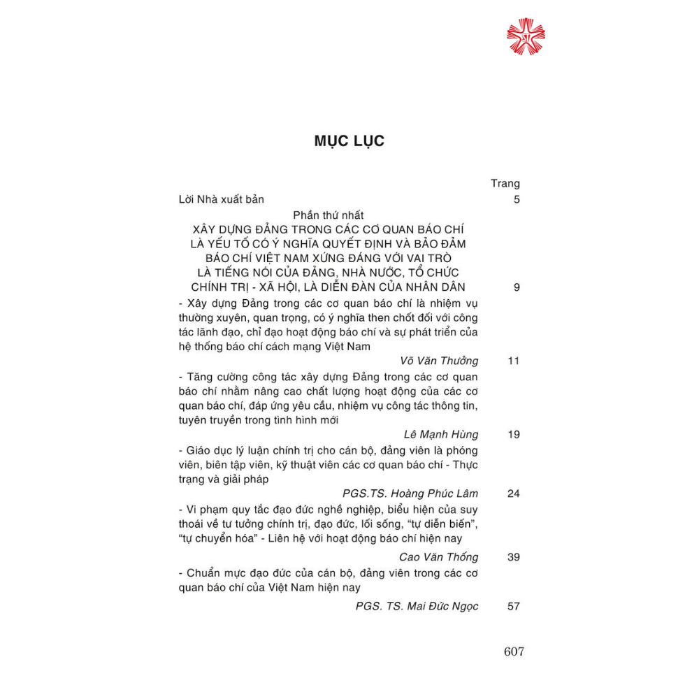 Mua tại TiktokCuốn sách tập hợp các bài tham luận trong Hội thảo khoa học “Tăng cường công tác xây dựng Đảng trong các cơ quan báo chí”, do Ban Tuyên giáo Trung ương Đảng chủ trì, phối hợp với Đảng uỷ Khối các cơ quan Trung ương, Báo Nhân Dân, Đài Truyền hình Việt Nam tổ chức. Nội dung cuốn sách gồm 2 phần, phản ánh khá đầy đủ, chân thực về công tác xây dựng Đảng trong các cơ quan báo chí, đề xuất những giải pháp thiết thực nhằm đáp ứng yêu cầu lãnh đạo, chỉ đạo hoạt động báo chí trong tình hình hiện nay.