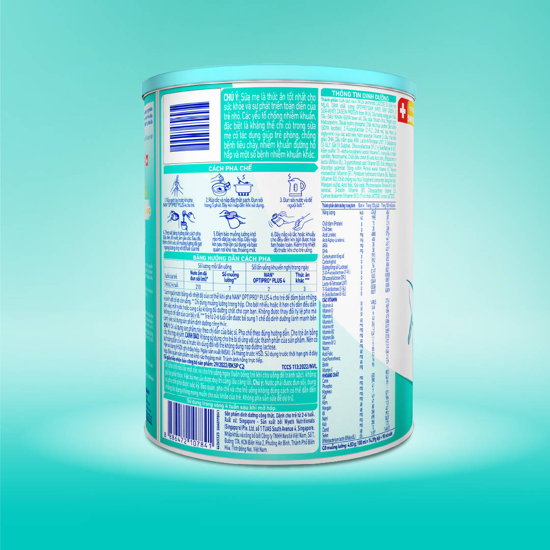 - NAN OPTIPRO PLUS 4 là sản phẩm với công thức cải tiến có chứa phức hợp quý 5HMO. Thành phần SỮA tách kem (MILK Skimmed), LACTOSE (Từ SỮA-From MILK), ĐẠM chất lượng OPTIPRO(ĐẠM WHEY, ĐẠM CASEIN từ SỮA-WHEY, CASEIN PROTEIN MILK), Dầu hướng dương giàu Oleic, Dầu ĐẬU NÀNH (SOYA bean oil), Dầu dừa, Tricalci citrat, Trinatri citrat, Maltodextrin, Dikali hydro phosphat, Chất nhũ hóa Lecithin ĐẬU NÀNH (SOYA lecithin), 2’-Fucosyllactose (2’-FL), Chất nhũ hóa Mono và diglycerid của các acid béo, Natri ascorbat (Vitamin C), Dầu vi tảo biển giàu DHA, Dầu nấm giàu ARA, Lacto-N-Tetraose (LNT), 3'-Sialyllactose (3’-SL), Sắt (II) Sulphat, Difucosyllactose (DFL), 6'-Sialyllactose (6’-SL), Kẽm sulfat, DL-alpha-tocopheryl acetat (Vitamin E), Hương liệu tự nhiên vanillin, Nicotinamid, Chất điều chỉnh độ acid Acid citric, Bifidobacterium lactis (Bifidus BL), D-pantothenat calci (Vitamin B5), Chất chống oxy hóa Ascorbyl palmitat, Đồng sulfat, Retinyl acetat (Vitamin A), Thiamin mononitrat (Vitamin B1), Pyridoxin hydroclorid (Vitamin B6), Riboflavin (Vitamin B2), Chất chống oxy hóa Tocopherol concentrat (dạng hỗn hợp), Mangan sulfat, Axit folic, Kali iodid, Phytomenadion (Vitamin K1), Natri selenat, D-biotin (Vitamin B7), Cholecalciferol (Vitamin D3), Cyanocobalamin (Vitamin B12). () có chứa LACTOSE (contain LACTOSE) Đối tượng sử dụng Dành cho bé từ 2 - 6 tuổi Hướng dẫn sử dụng