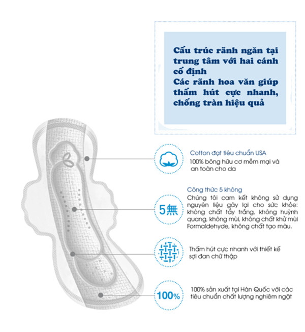 - BVS có bề mặt được làm bằng 100% cotton tự nhiên (với logo cotton USA duy nhất tại Hàn Quốc) mềm mại và thân thiện với cả những làn da nhạy cảm. Siêu thấm